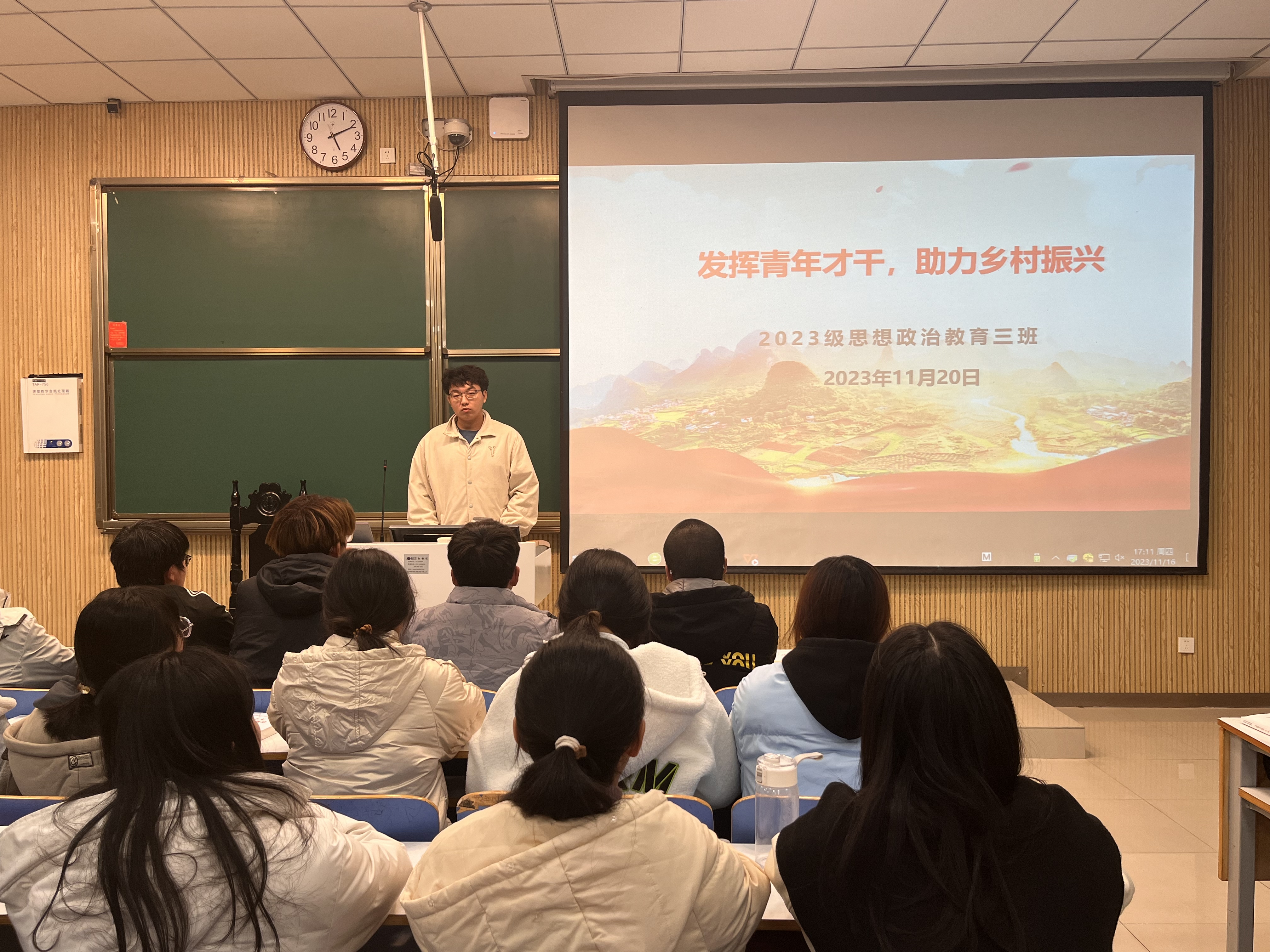 为推动建设美丽中国,发挥青年才干,11月20日上午,ok138cn太阳集团5292023级思想政治教育三班在社科楼515教室召开“发挥青年才干,助力乡村振兴”主题团课。我院2023级思想政治教育三班全体成员共同参加此次团课,团课由团支书郝瀚主持。
