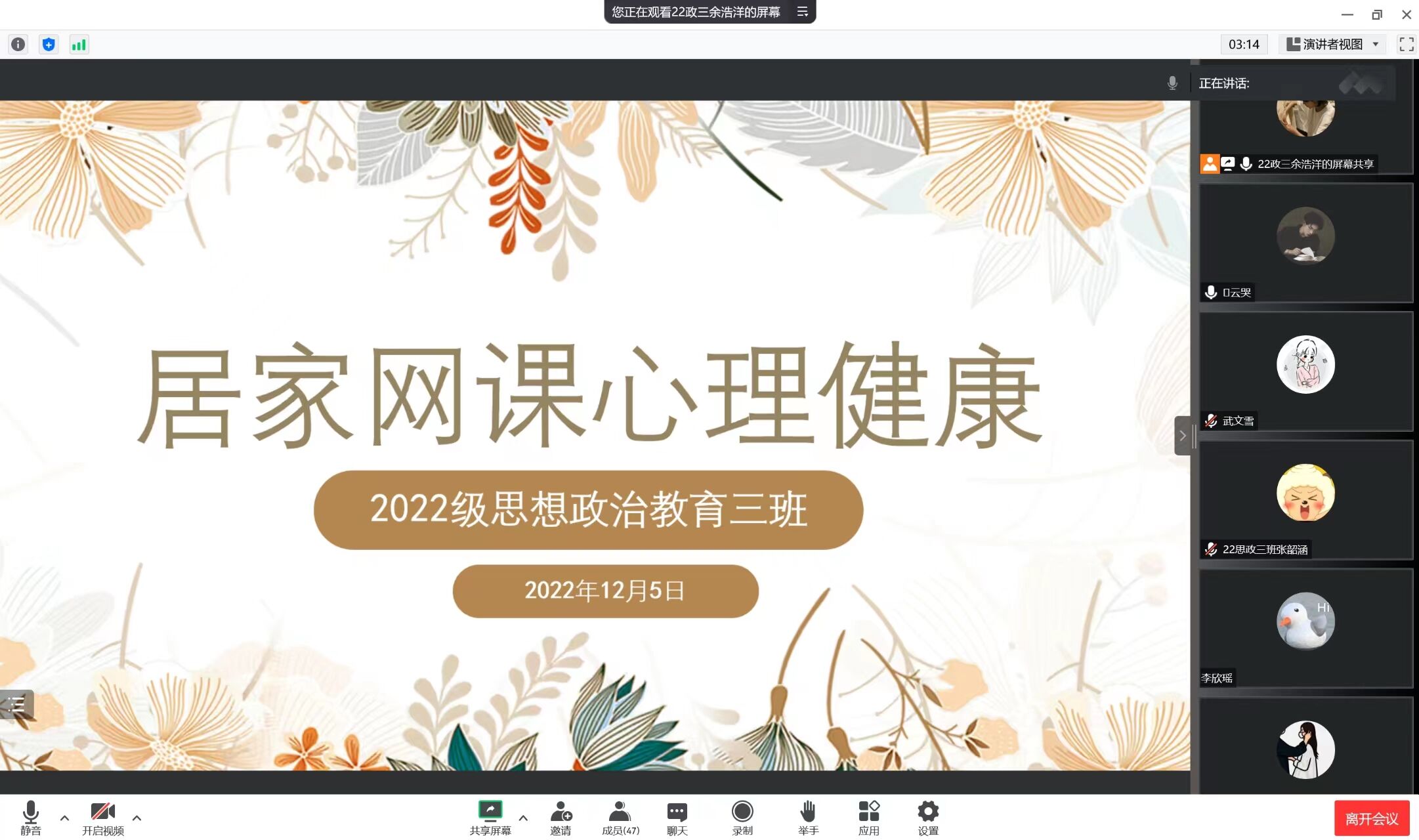 为缓解学习压力,激发拼搏动力,12月5日上午,ok138cn太阳集团5292022级思想政治教育三班在线上召开居家网课心理健康主题班会。我院2022级思想政治教育三班全体成员共同参与此次班会,班会由心理委员张韶涵主持。