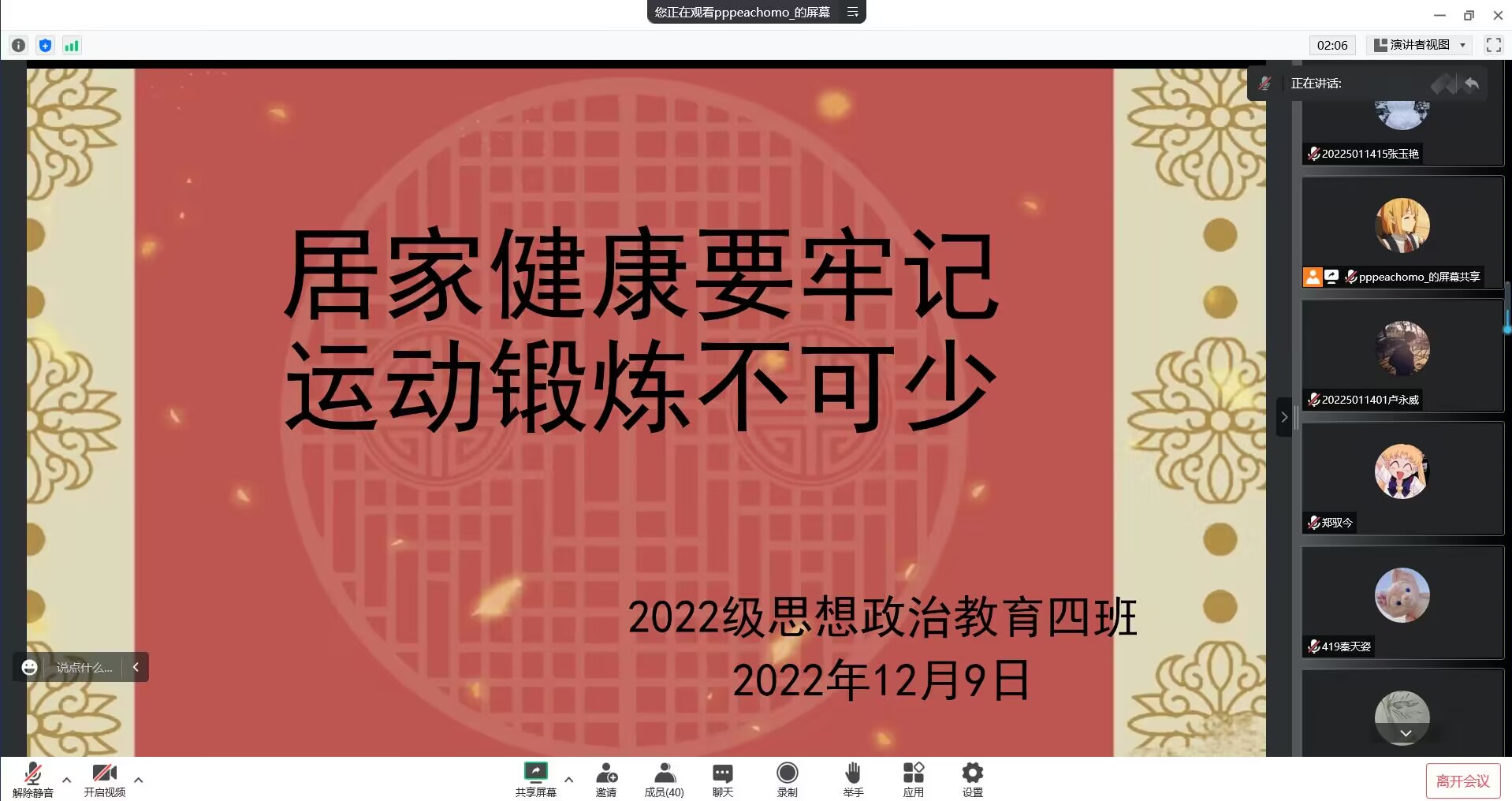 12月9日下午,ok138cn太阳集团5292022级思想政治教育四班线上召开“居家健康要牢记,运动锻炼不可少”主题班会,2022级思想政治教育四班全体同学参与本次班会。会议由文体委员周可盈主持。