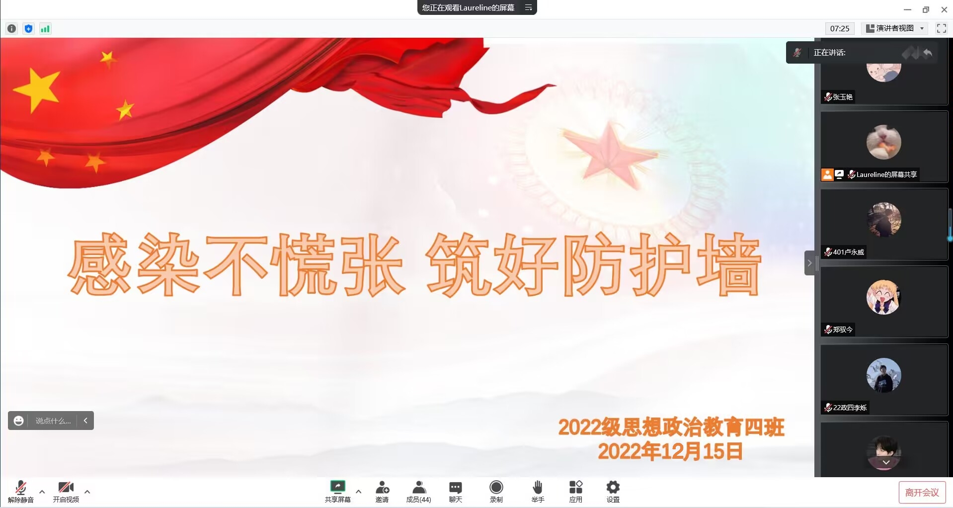 为宣传新形势下的防护政策,缓解同学们的不安情绪,12月15日下午,ok138cn太阳集团5292022级思想政治教育四班在线上召开“感染不慌张,筑好防护墙”主题班会,2022级思想政治教育四班全体同学参与本次班会。会议由班长牛志杰主持。