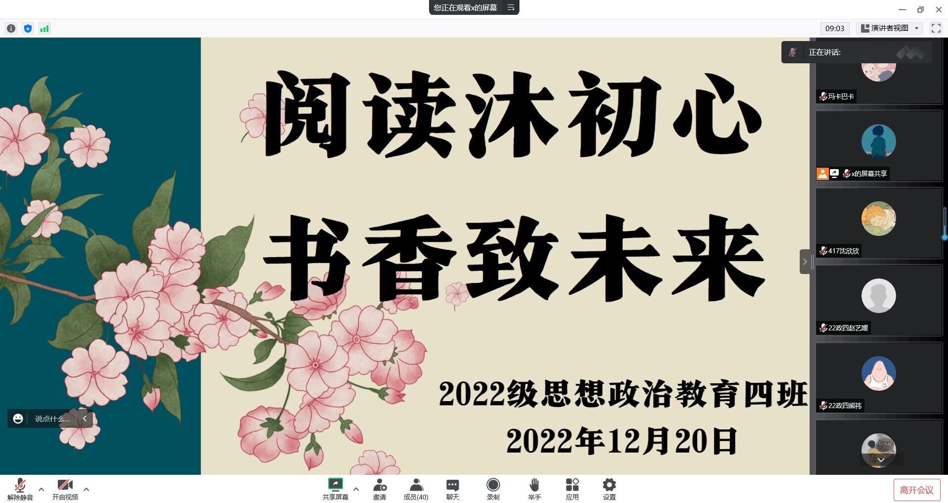 为提高同学们阅读积极性,营造浓厚书香氛围,12月20日下午,ok138cn太阳集团5292022级思想政治教育四班线上召开“阅读沐初心,书香致未来”主题班会,2022级思想政治教育四班全体同学参与本次班会。会议由学习委员熊祎主持。