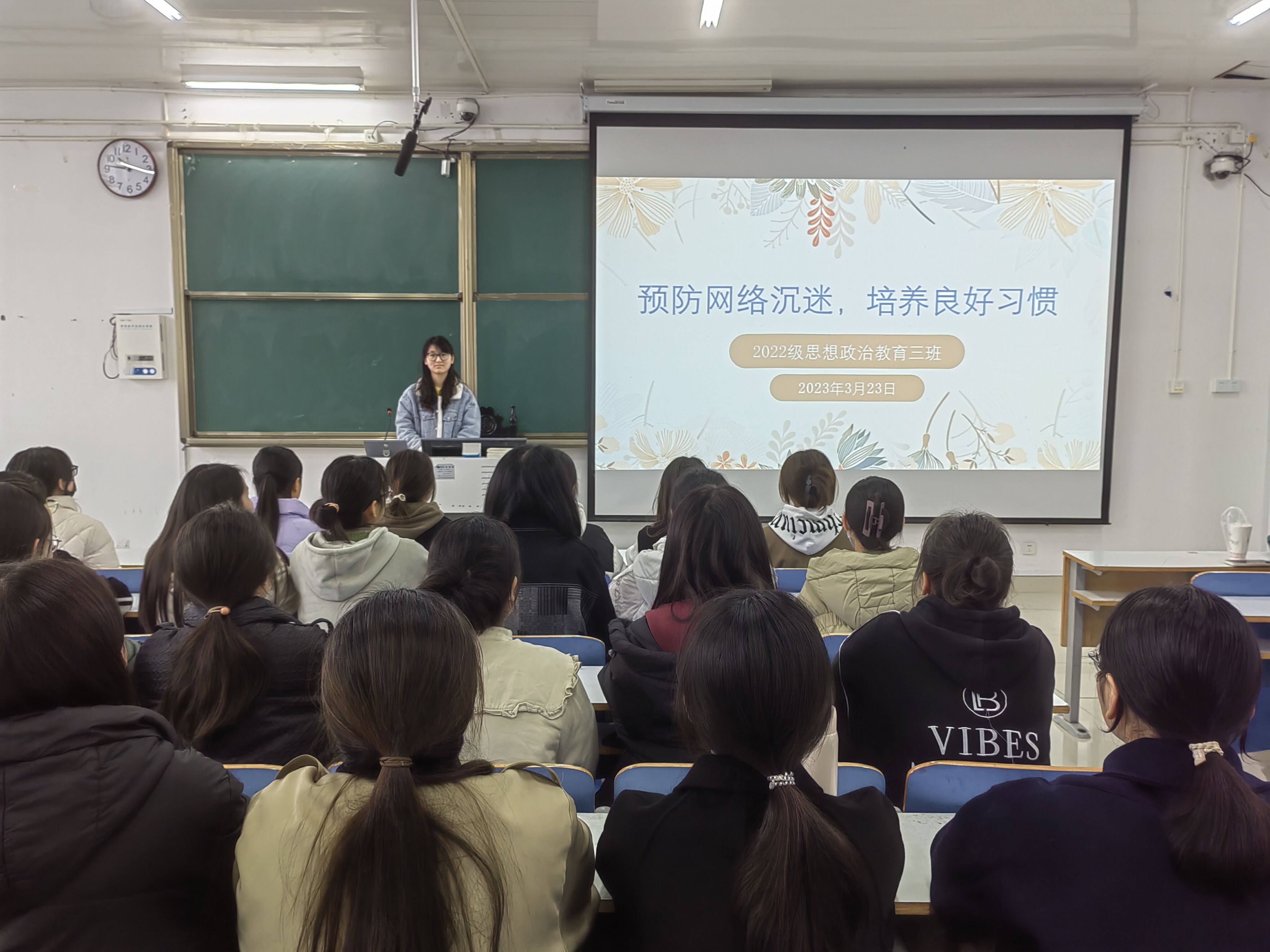 为预防网络沉迷寻方法、找路径,3月23日上午,ok138cn太阳集团5292022级思想政治教育三班在社科楼515教室召开“预防网络沉迷,培养良好习惯”主题班会。我院2022级思想政治教育三班全体成员共同参与此次班会。班会由心理委员张韶涵主持。