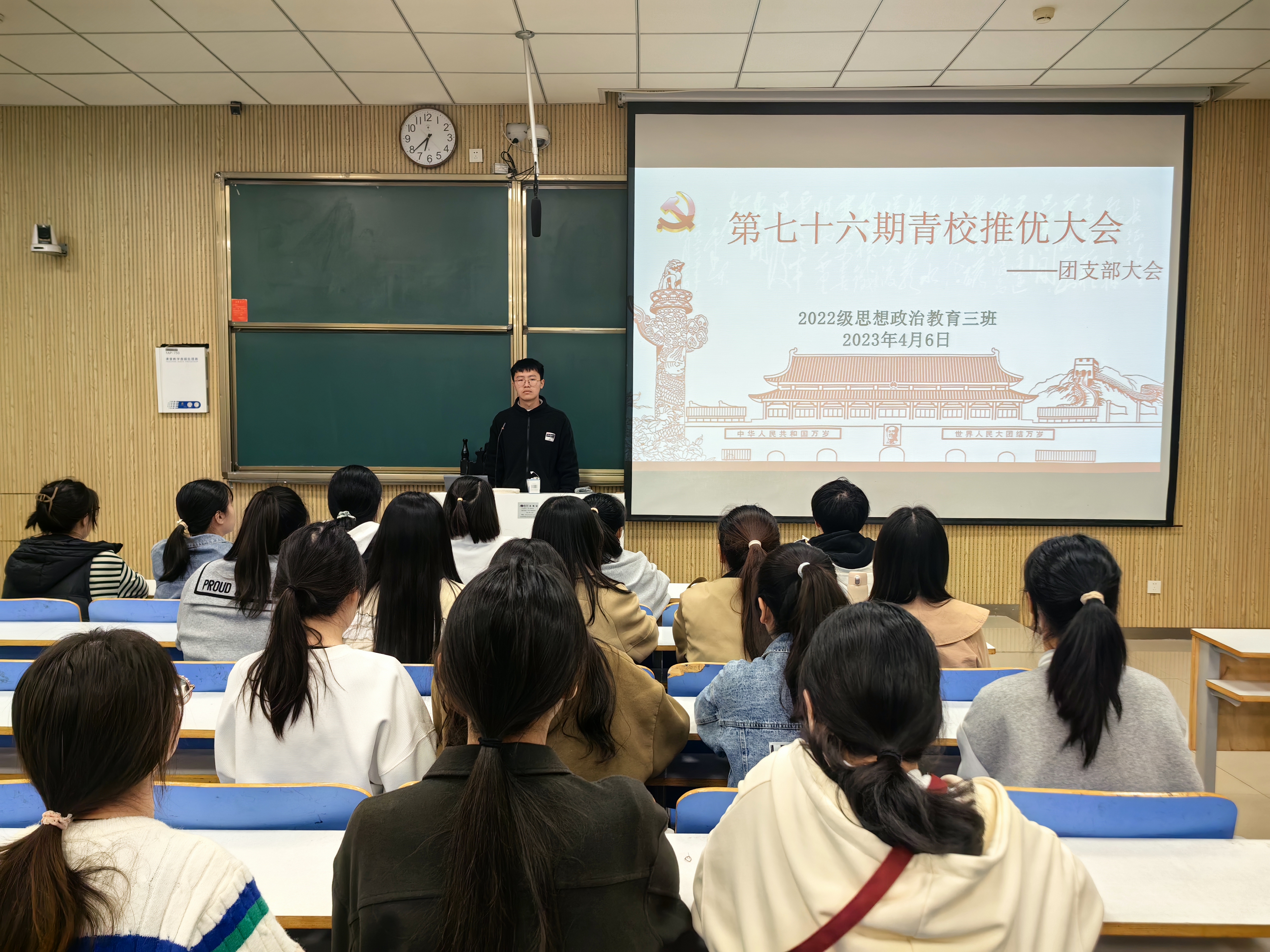 4月6日下午,ok138cn太阳集团5292022级思想政治教育三班在社科楼515教室召开青校推优大会。我院2022级思想政治教育三班班主任吴梦云以及三班全体同学共同参与此次大会。大会由团支书余浩洋主持。