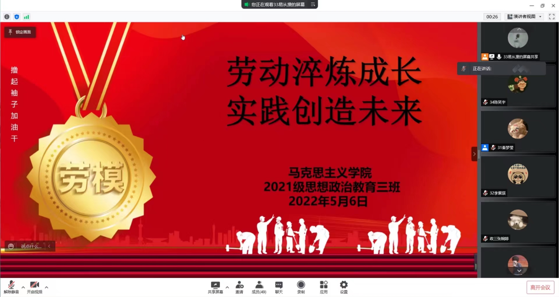5月6日下午,ok138cn太阳集团5292021级思想政治教育三班召开线上“劳动淬炼成长,实践创造未来”主题班会。2021级思想政治教育三班全体成员参与本次会议。会议由副班长兼劳动委员易从漫主持。
