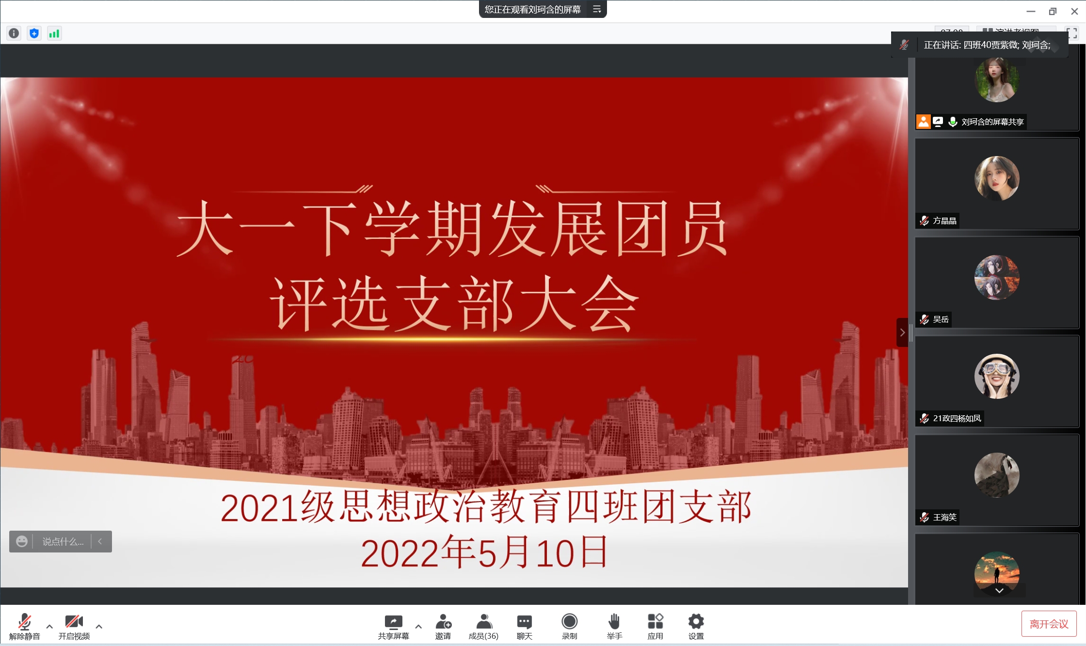 5月10日晚,ok138cn太阳集团5292021级思想政治教育四班线上召开大一下学期发展团员民主评议会。2021级思想政治教育四班全体团员共同参会。会议由团支书刘珂含主持。