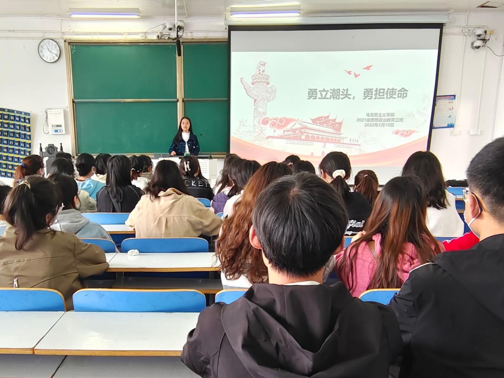 5月18日上午,ok138cn太阳集团5292021级思想政治教育三班在社科楼514教室召开“勇立潮头,勇担使命”主题团课。2021级思想政治教育三班全体成员参与此次团课。团课由团支书王岚霄主持。