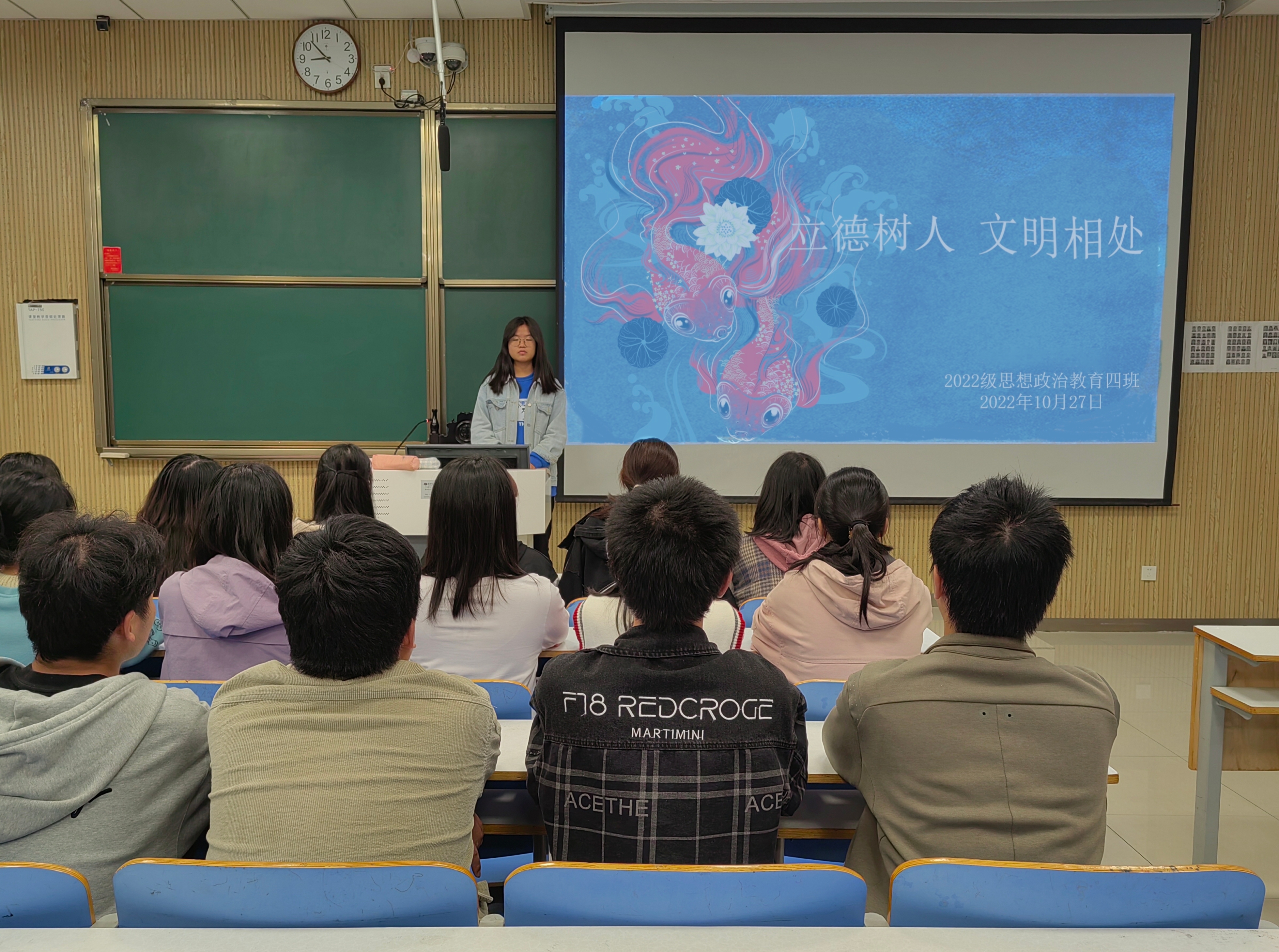 为营造文明校园氛围,提高同学们文明素养,10月27日下午,ok138cn太阳集团5292022级思想政治教育四班在社科楼515教室召开“立德树人,文明相处”主题班会。会议由学习委员熊祎主持。