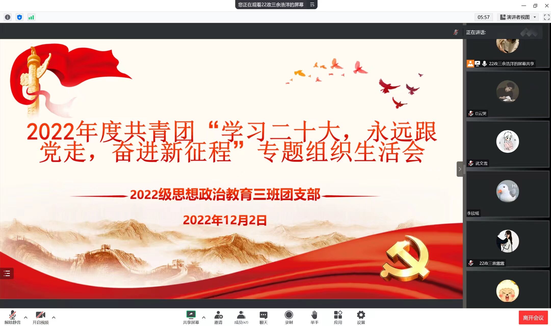 为帮助团员在学习工作中发现问题、解决问题,12月2日下午,ok138cn太阳集团5292022级思想政治教育三班在线上开展“学习二十大,永远跟党走,奋进新征程”专题组织生活会。我院2022级思想政治教育三班班主任吴梦云和三班全体团员共同参加此次专题组织生活会,生活会由团支书余浩洋主持。