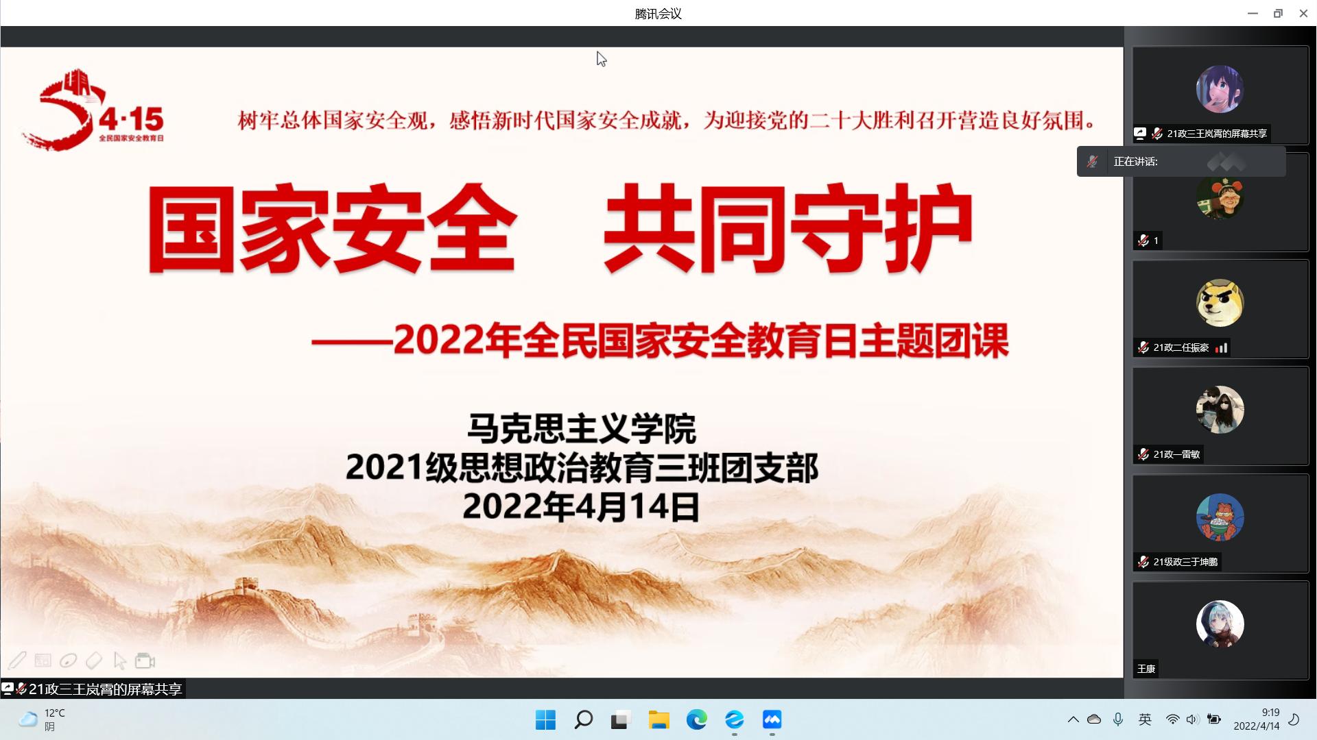 4月14日上午,ok138cn太阳集团5292021级思想政治教育三班召开线上“国家安全,共同守护”主题团课。2021级思想政治教育三班全体团员参加此次团课。团课由团支部副书记王岚霄主持。