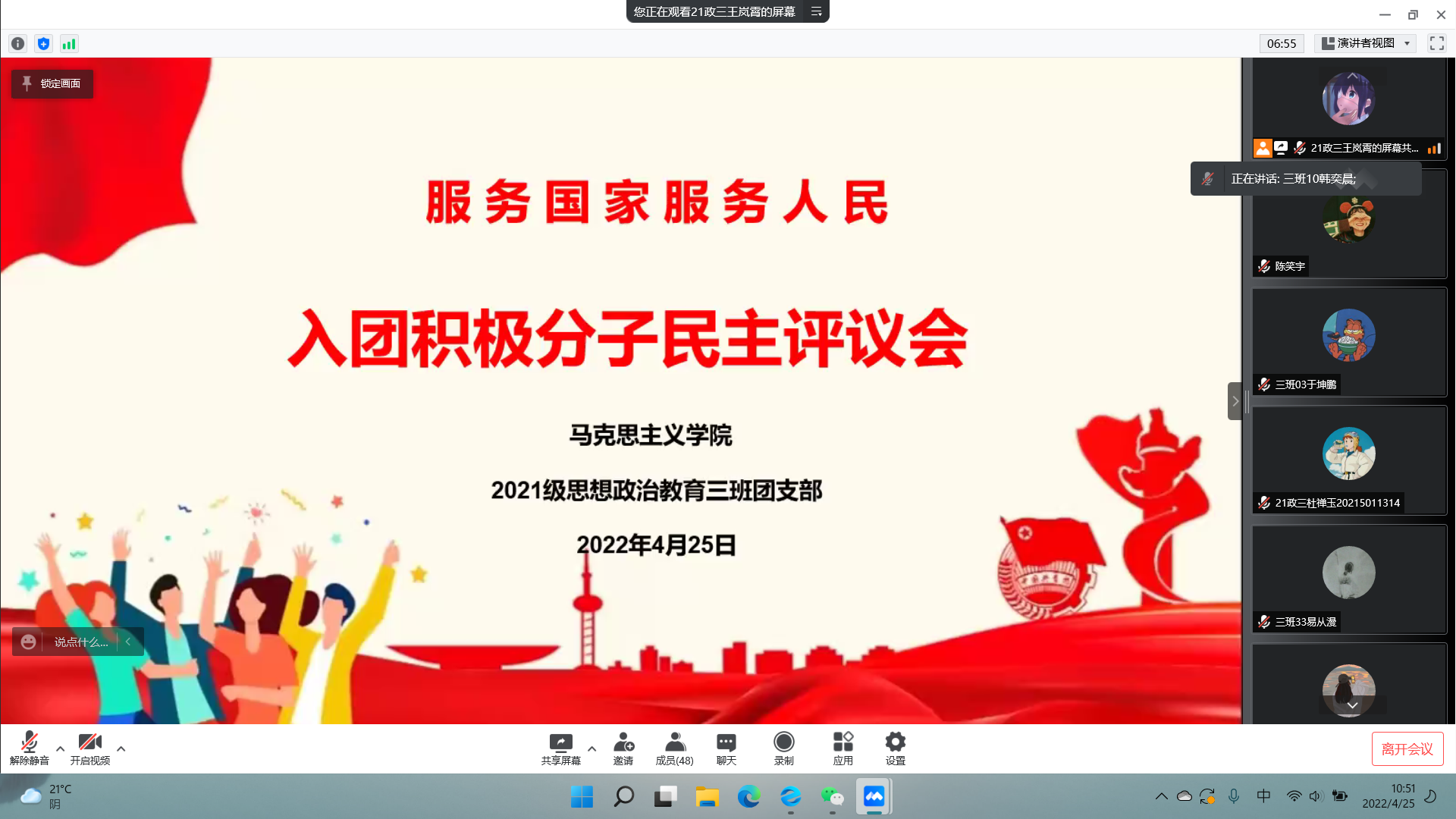 4月25日上午,ok138cn太阳集团5292021级思想政治教育三班召开线上2022年上半年入团积极分子民主评议会。2021级思想政治教育三班全体团员以及三位候选人参加了此次会议,会议由团支书王岚霄主持。