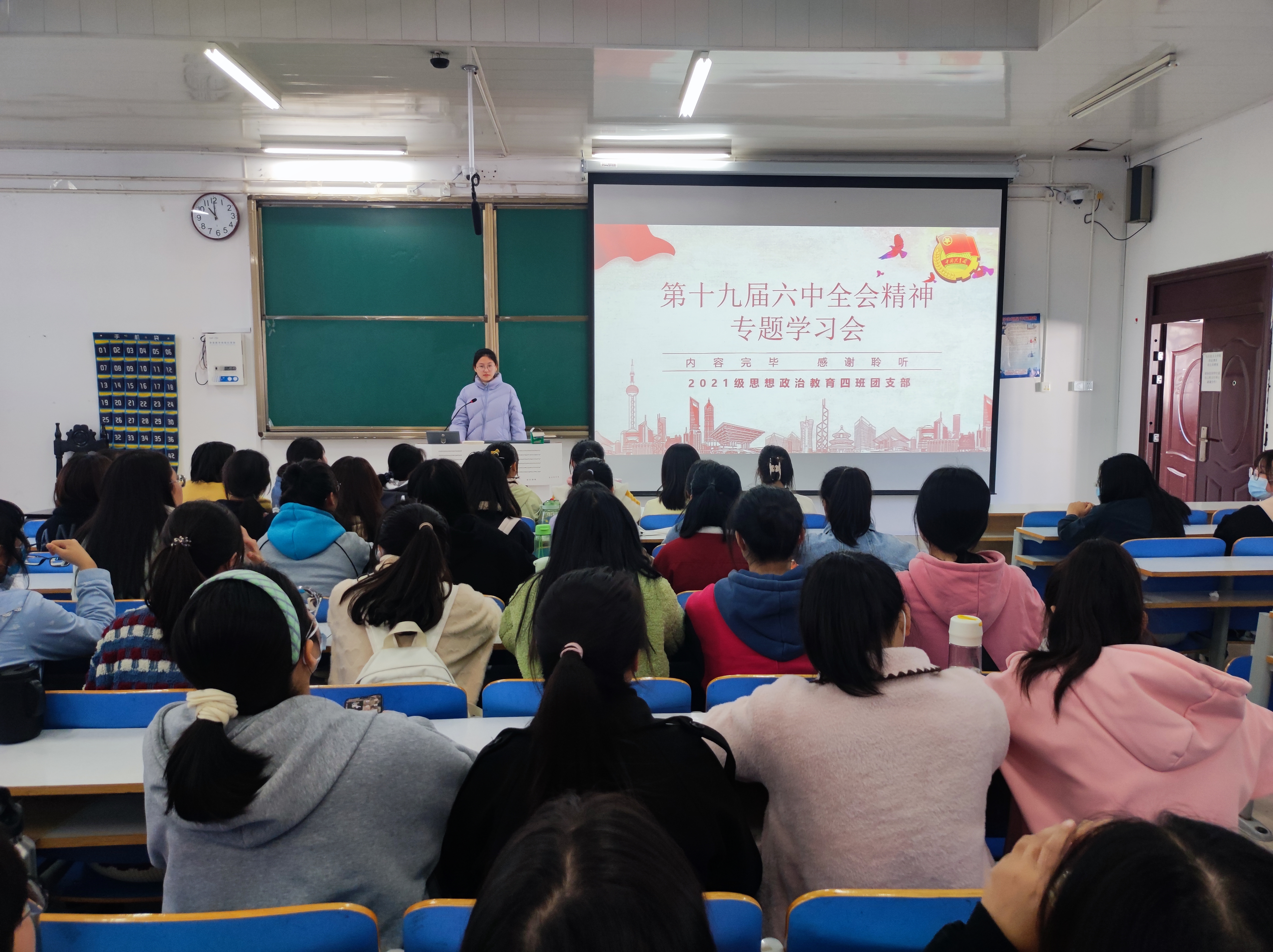 11月18日下午,ok138cn太阳集团5292021级思想政治教育四班在社科楼514教室召开十九届六中全会精神专题学习会,2021级思想政治教育四班全体同学参加了本次专题学习会。专题学习会由团支书刘珂含主持。