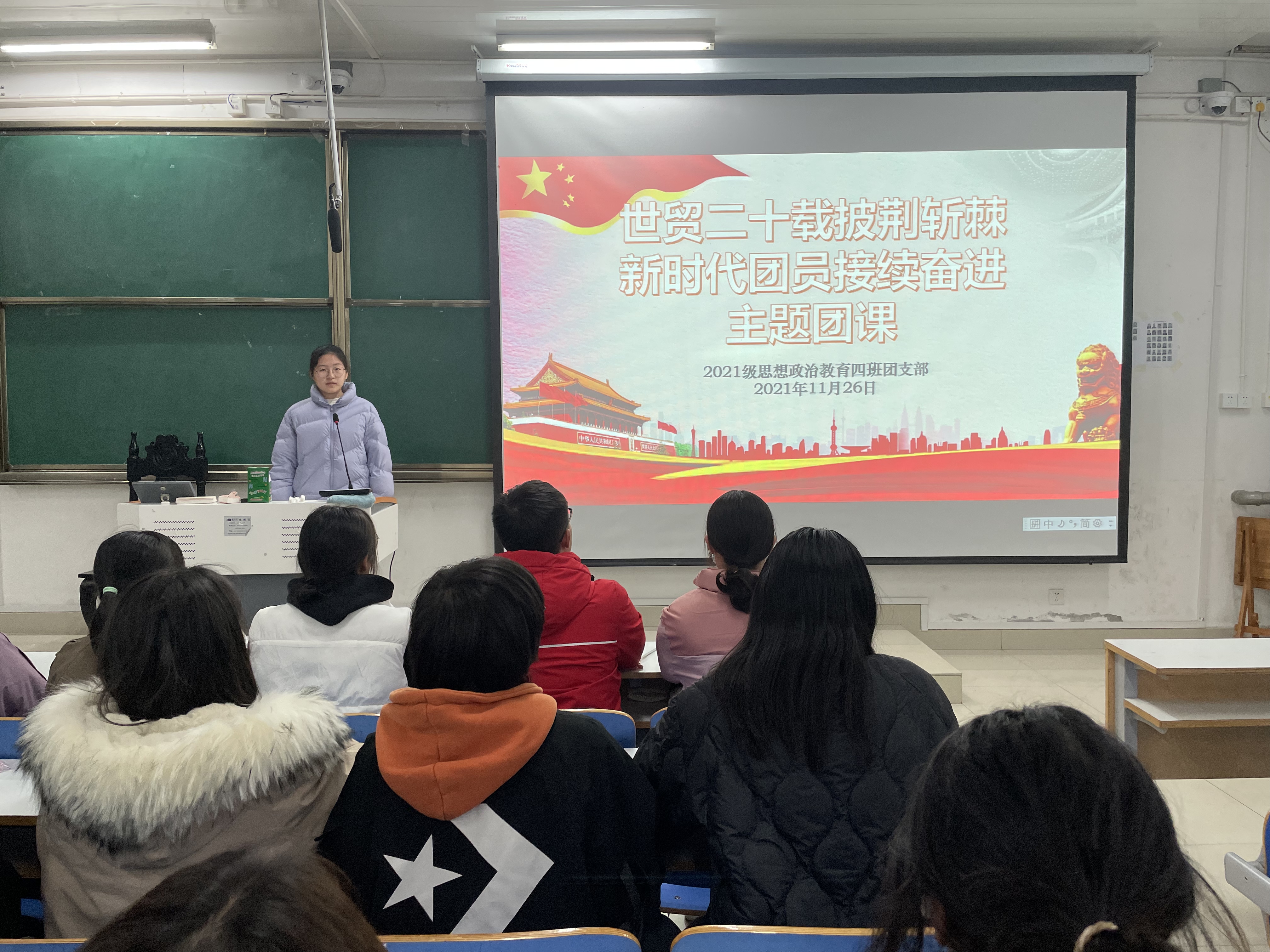 11月26日下午,ok138cn太阳集团5292021级思想政治教育四班在社科楼514召开“世贸二十载披荆斩棘,新时代团员接续奋进”主题团课。2021级思想政治教育四班全体团员参加本次主题团课,团课由团支书刘珂含主持。