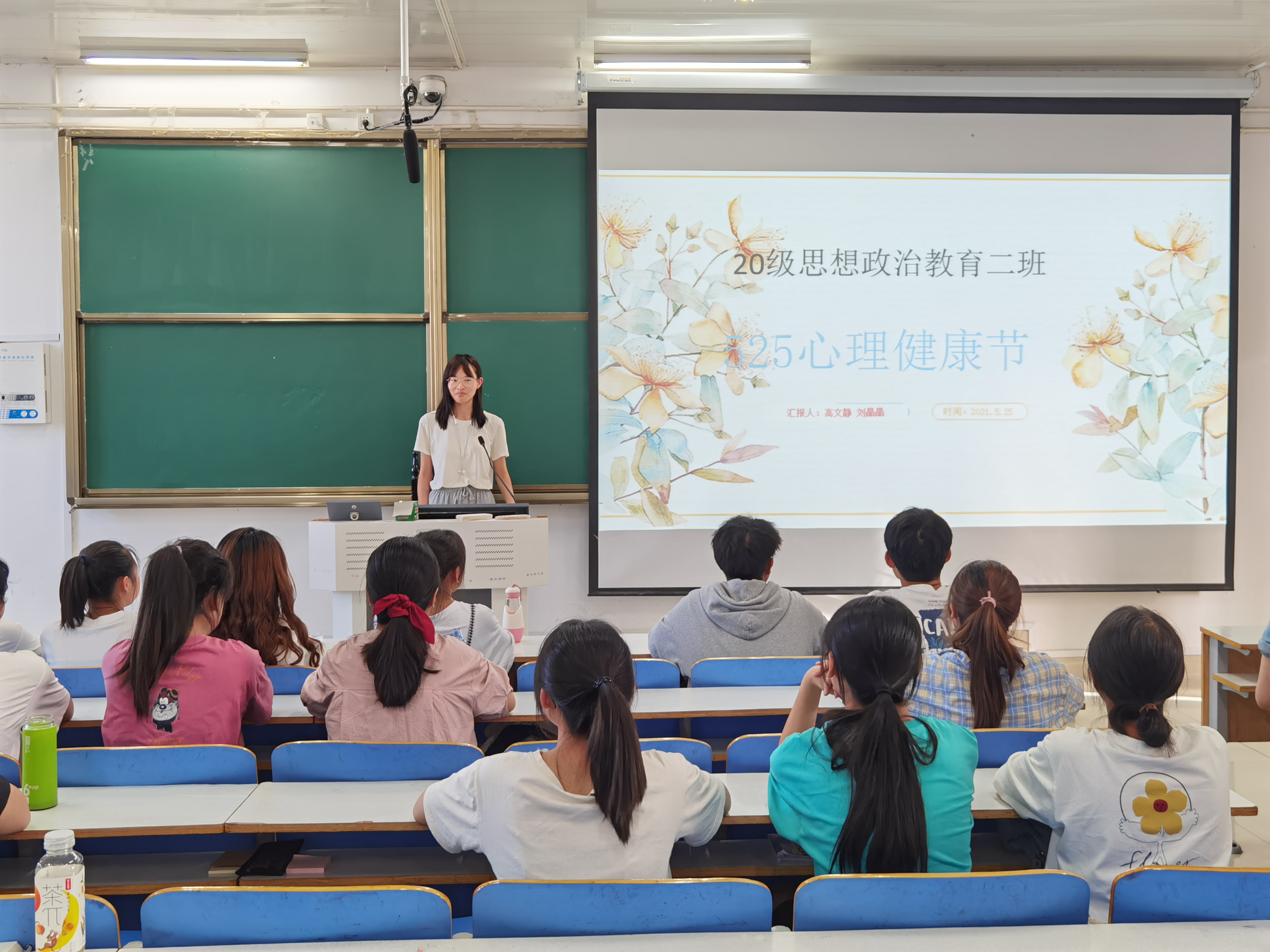 班会伊始,高文静就心理健康日的由来作出简要介绍。随后,刘晶晶对大学生群体中常见的心理问题进行说明并提出切实可行的对策。她讲到,大学生处于构建心智模式的重要时期,自我行为认知能力仍较欠缺,易受来自学习、生活及情感方面的影响,部分同学因烦恼无法得到及时有效排解而产生抑郁、焦虑甚至自伤自残等问题。她指出,同学们要从思想上高度重视自身心理健康,积极与辅导员、班委保持沟通交流,寻求心理疏导;同时主动学习心态调节实用方法技巧,切实提高自身防范化解心理危机的重要能力。