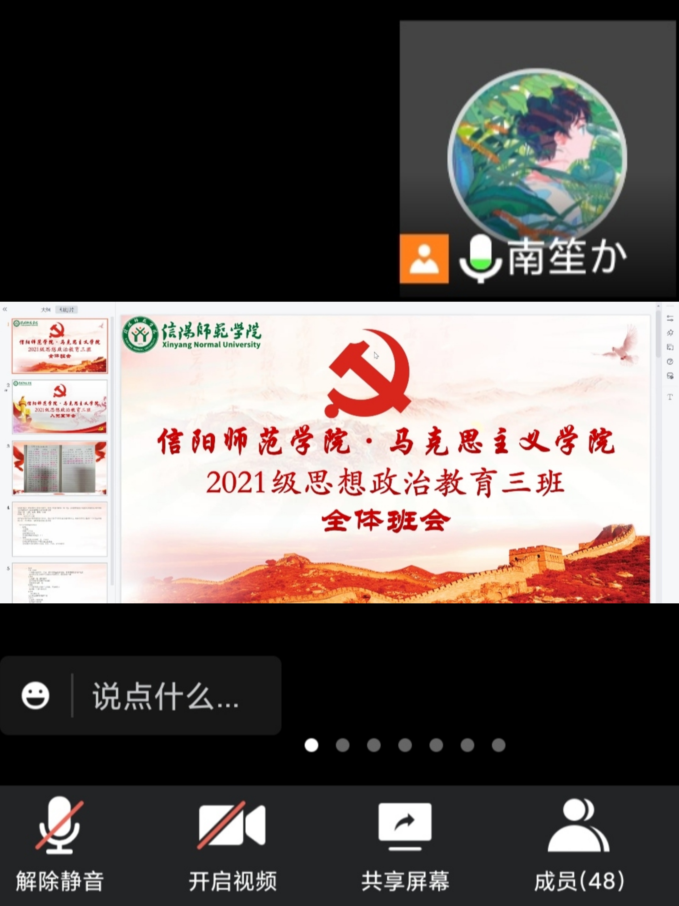 为增强同学们对入党的重视和调动同学们参与班务的积极性,10月14日晚上,ok138cn太阳集团5292021级思想政治教育三班入党宣传会暨全体班会在腾讯会议上顺利召开。ok138cn太阳集团5292021级思想政治教育三班全体同学共同参加,会议由团支书郭少华和副班长王岚霄主持。