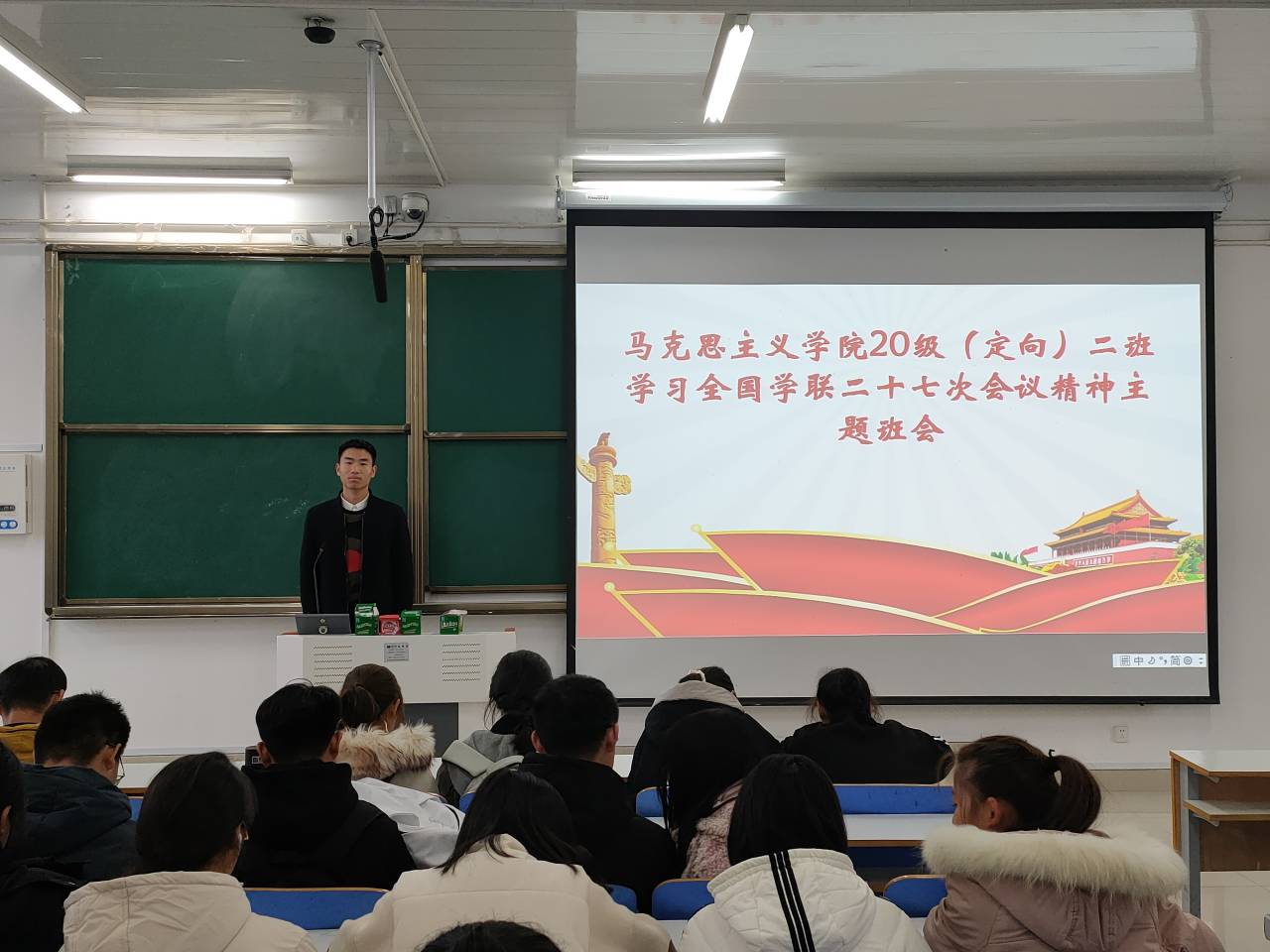 11月24日,ok138cn太阳集团5292020级思想政治教育定向二班学习全国学联二十七次会议精神主题班会在社科楼514教室顺利开展。定向二班全体同学参与此次班会。班会由高红凯主持。