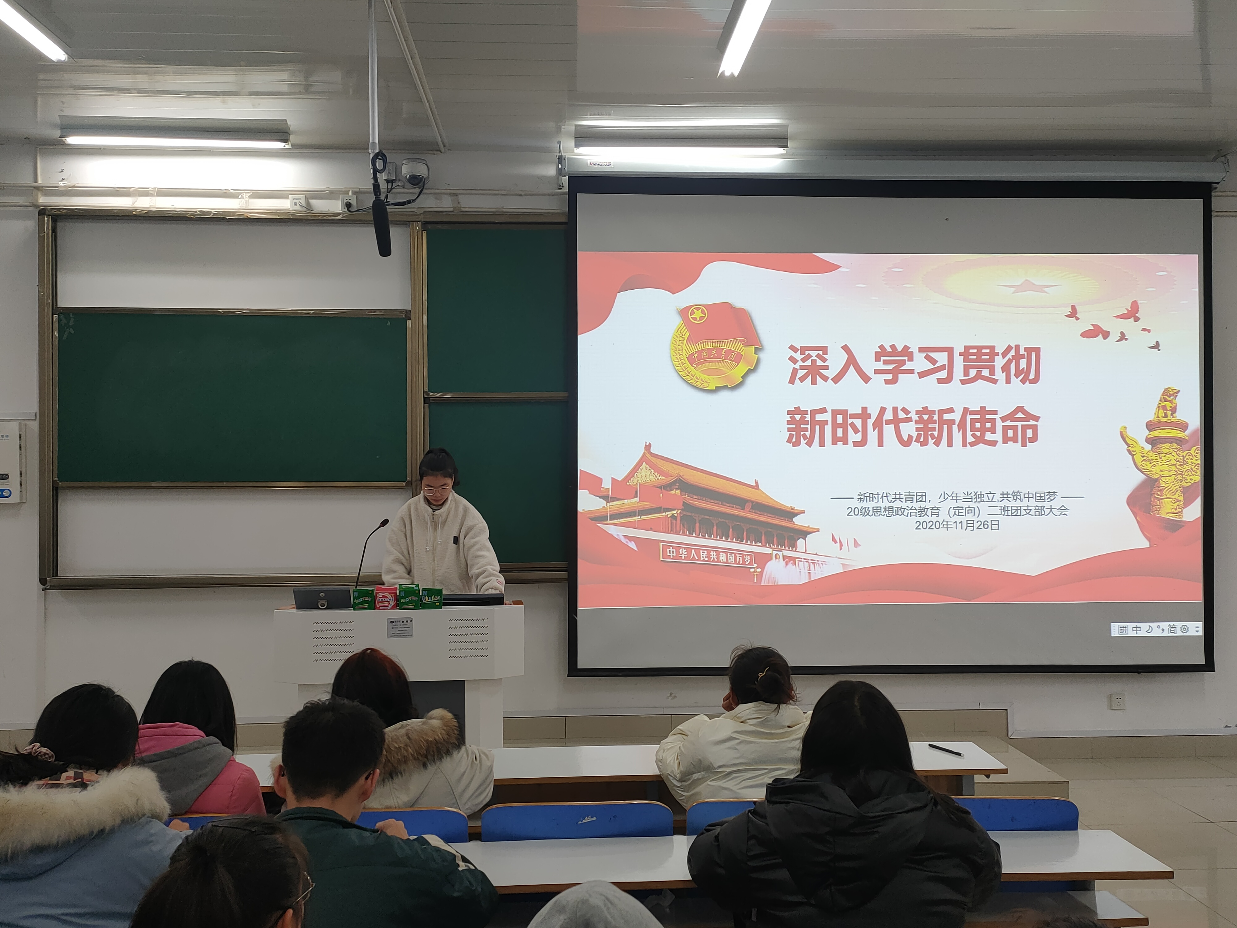 为促进同学们深入学习共青团知识,自觉担当新时代新使命,11月26日,ok138cn太阳集团5292020级思想政治教育定向二班“担当新使命,共筑中国梦”主题团支部大会在社科楼514教室顺利召开。定向二班全体团员参与此次会议。大会由团支书李晨曦主持。