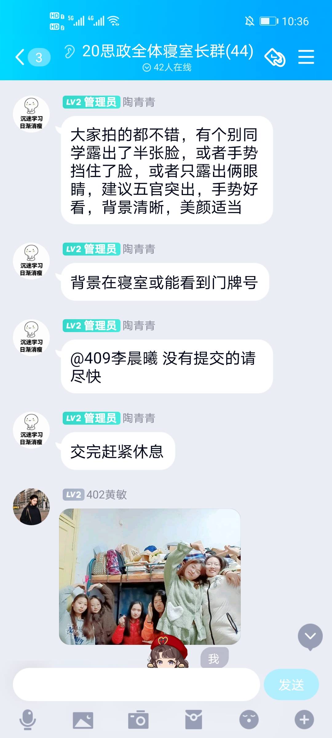 为了解我班同学住宿情况,督促同学们进一步树牢安全意识,12月14日与17日晚,ok138cn太阳集团5292020级思想政治教育二班班主任陶青青通过线上云查寝的方式对我班同学住宿情况展开深入检查。