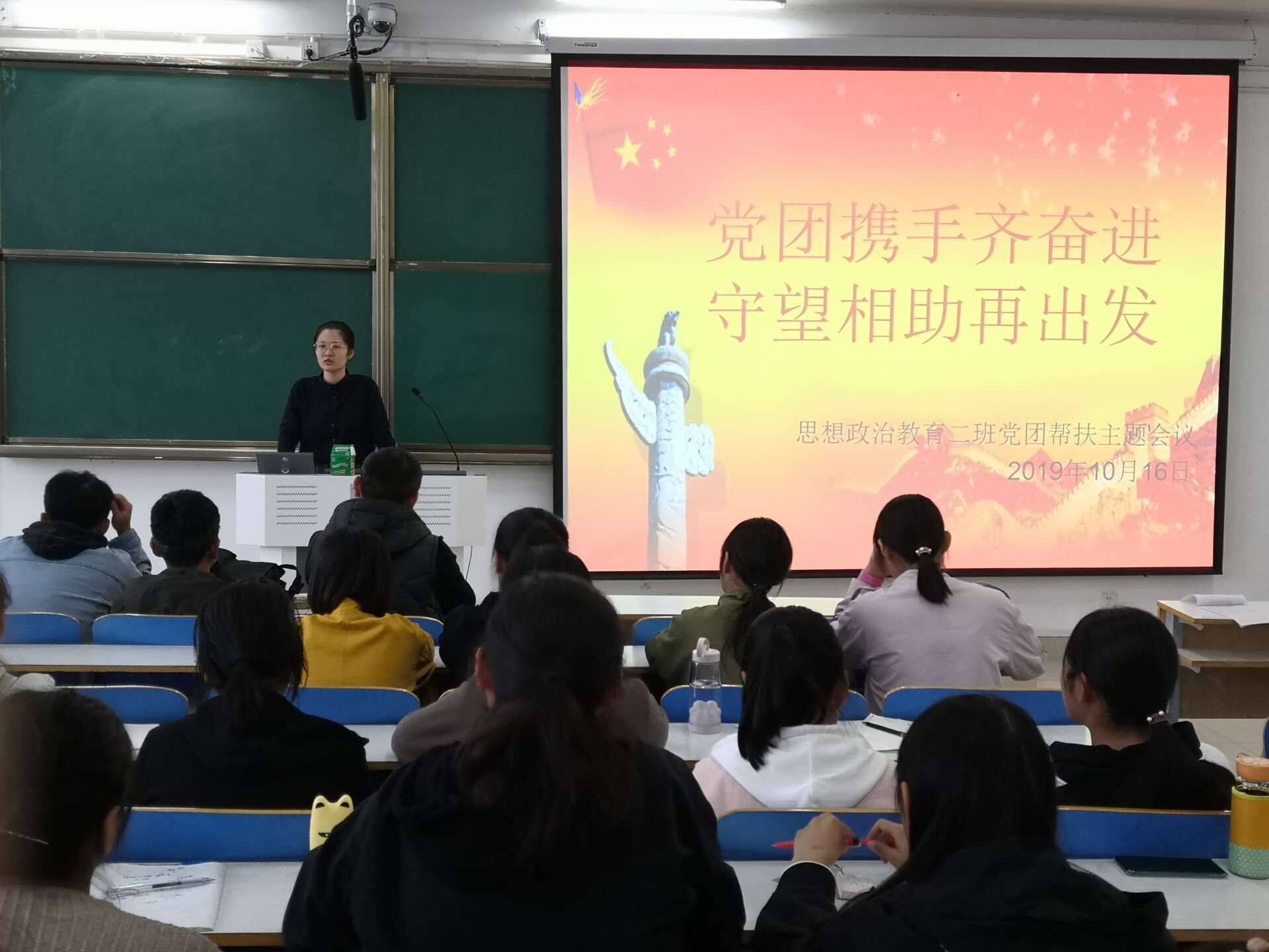 为提高2019级新生适应大学校园生活的能力,10月16日上午,ok138cn太阳集团5292019级思想政治教育二班在社科楼514教室顺利开展党团帮扶班会。党团帮扶小组成员张雅琼、刘冰以及2019级思想政治教育二班全体同学共同参会。本次班会由团支书孙雅娴主持。