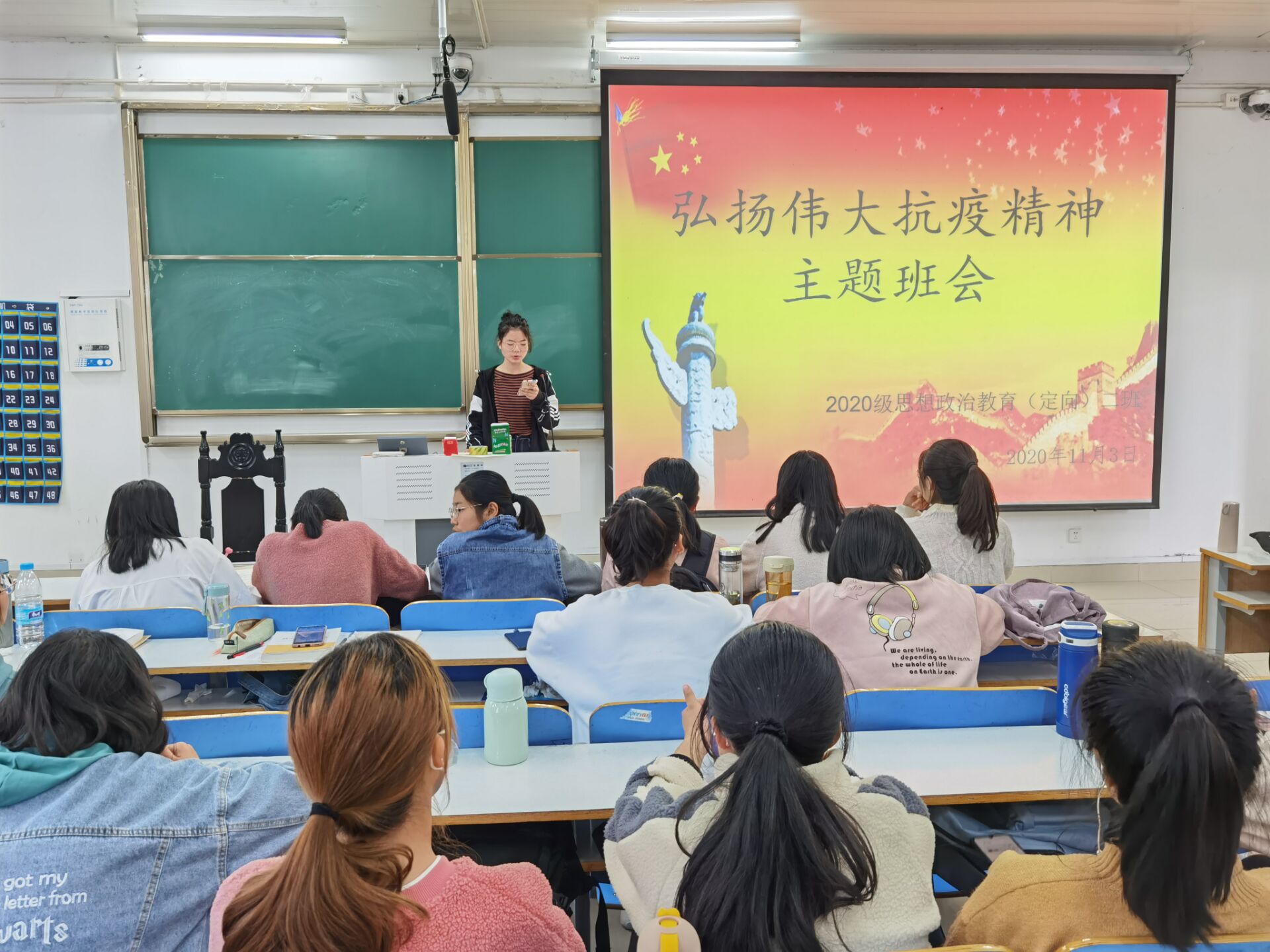 为大力弘扬伟大抗疫精神、激发学生的爱国热情,11月3日上午,ok138cn太阳集团5292020级思想政治教育定向二班在社科楼514教室召开了“弘扬伟大抗疫精神”主题班会。班会由团支书李晨曦主持。