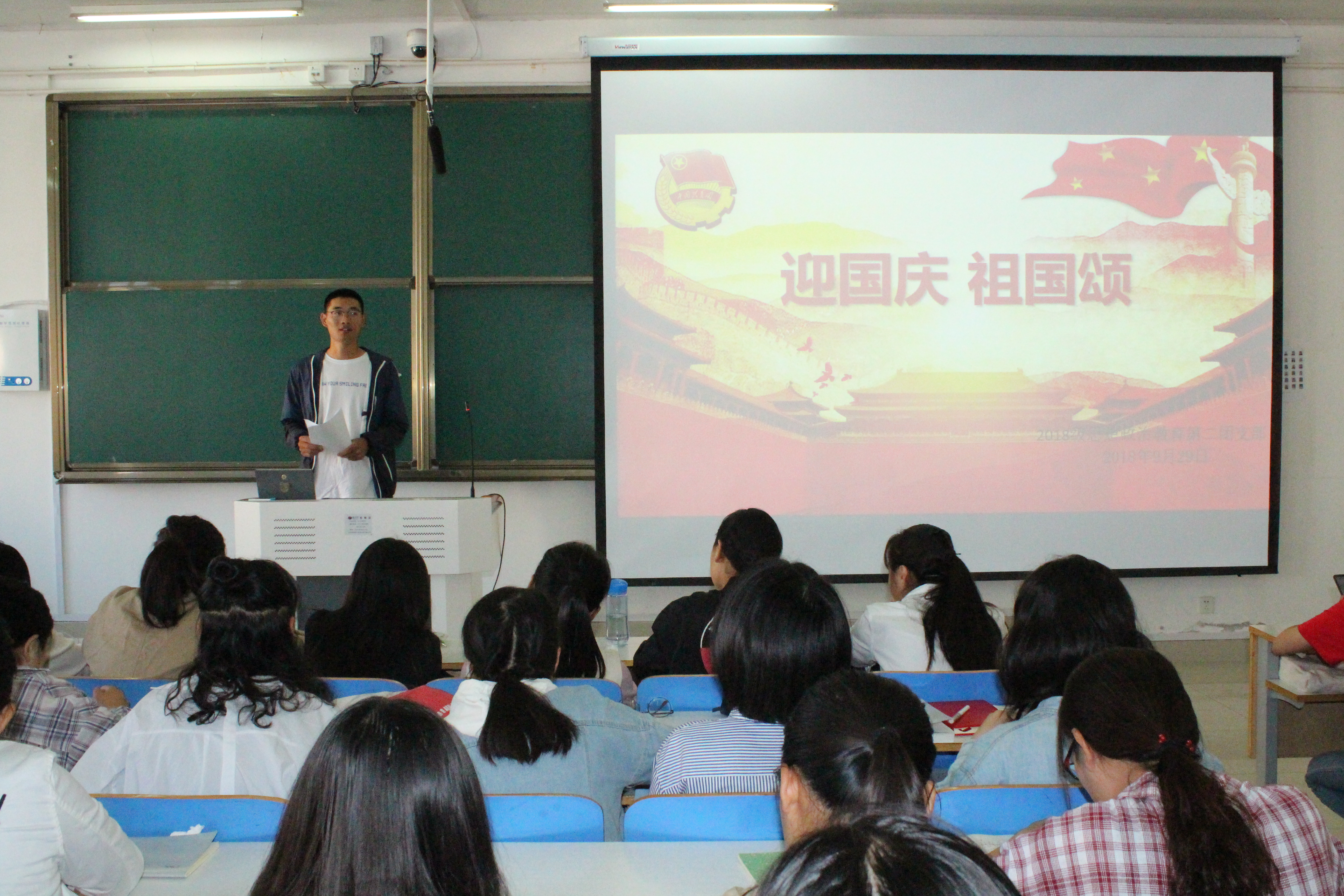 为纪念祖国成立69周年,激发我院学子爱国热情,9月29日上午,ok138cn太阳集团5292018级第二团支部召开“迎国庆、祖国颂”的主题班会。我院2018级思想政治教育二班全体学生共同参加了本次班会。班会由班长杨康主持。