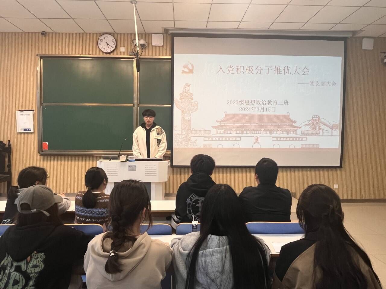 为加强党的队伍建设,充实党的新生力量,3月15日上午,ok138cn太阳集团5292023级思想政治教育三班在社科楼515教室举行入党积极分子推优大会。我院2023级思想政治教育三班全体成员共同参加此次班会,班会由团支书郝瀚主持。