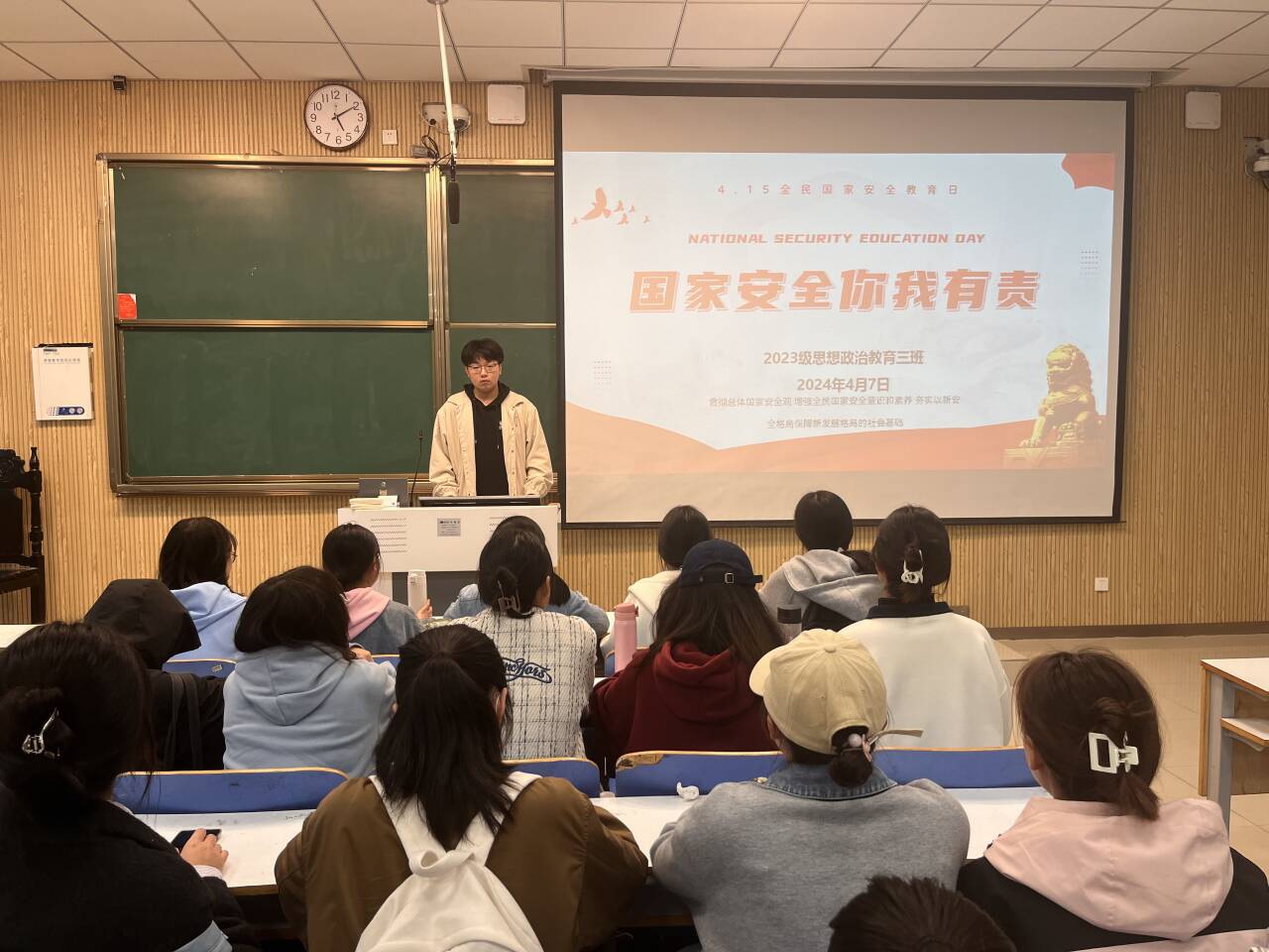 为深入贯彻总体国家安全观,进一步增强学生国家安全和法治意识,培养学生的爱国情怀,4月7日下午,ok138cn太阳集团5292023级思想政治教育三班在社科楼515教室举行“国家安全你我有责”主题班会。我院2023级思想政治教育三班全体成员共同参加此次班会,班会由团支书郝瀚主持。