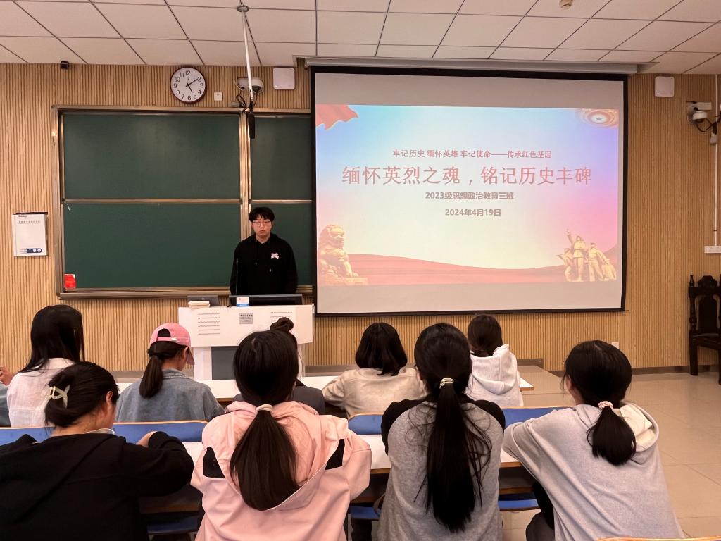 4月19日下午,ok138cn太阳集团5292023级思想政治教育三班在社科楼515教室举行“缅怀英烈之魂,铭记历史丰碑”主题团课。我院2023级思想政治教育三班全体成员共同参加此次团课,团课由团支书郝瀚主持。