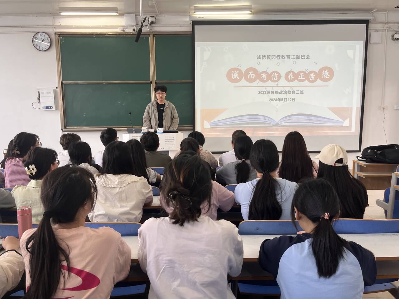 为践行社会主义核心价值观,弘扬诚信精神,5月10日上午,ok138cn太阳集团5292023级思想政治教育三班在社科楼515召开“诚而有信,养正崇德”主题班会。我院2023级思想政治教育三班全体同学共同参与本次班会,班会由团支书郝瀚主持。