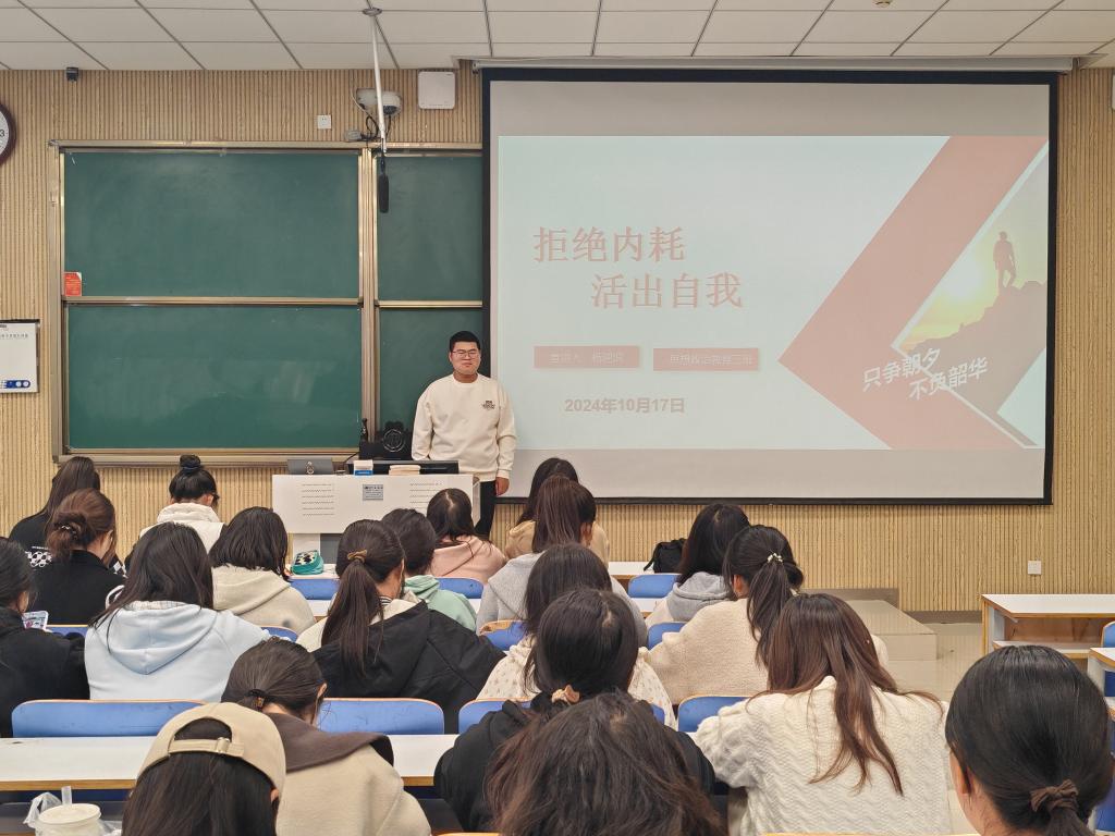 班会伊始,杨迎滨通过生动的案例和深入浅出的讲解,向同学们阐述了内耗的概念及其表现形式。他指出,内耗是指个体在心理上对自我的过度消耗,表现为过度的焦虑、自责、拖延等负面情绪和行为。内耗不仅会影响个人的身心健康,还会阻碍个人成长和发展。随后,班会进入互动环节,同学们纷纷分享了自己在学习、生活中遇到的困扰和挑战,以及自己是如何应对这些困扰和挑战的。通过这些分享,同学们更加深刻地理解了内耗的危害,也学会了更多有效的应对策略。为了进一步增强同学们的实践能力,班会设置了小组讨论环节。同学们被分成若干小组,围绕“如何拒绝内耗,活出自我”这一主题展开讨论,大家集思广益,提出了许多切实可行的建议和方法。