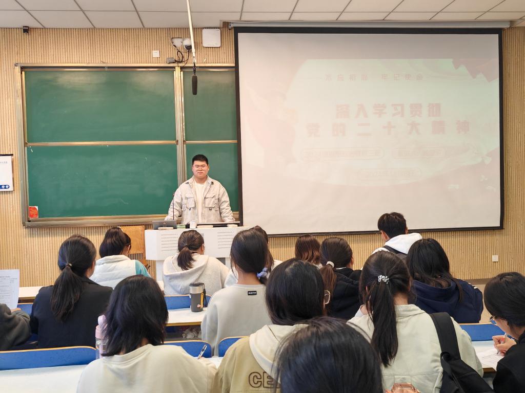团课伊始,学生代表刘洋瑞和张茵主动向同学们分享她们对党的二十大精神的认识与理解。然后杨迎滨带领同学们深入研读了党的二十大的相关内容,并细致讲解了党的二十大精神及其深远意义。之后,杨迎滨结合社会各界青年将二十大精神付诸实践的具体事例,让同学们对党的二十大精神有了更为深刻的认识和思考,激发了同学们积极投身社会实践的热情。
