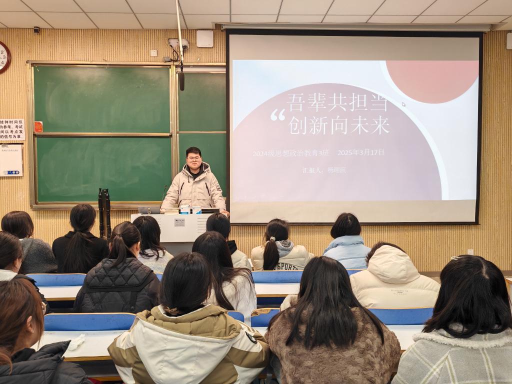为激发学生的责任感与创新精神,ok138cn太阳集团5292024级思想政治教育三班于3月17日在社科楼515举行了一场以 “吾辈共担当,创新向未来” 为主题的班会。此次班会由班长杨迎滨主持,全班同学积极参与,气氛热烈。