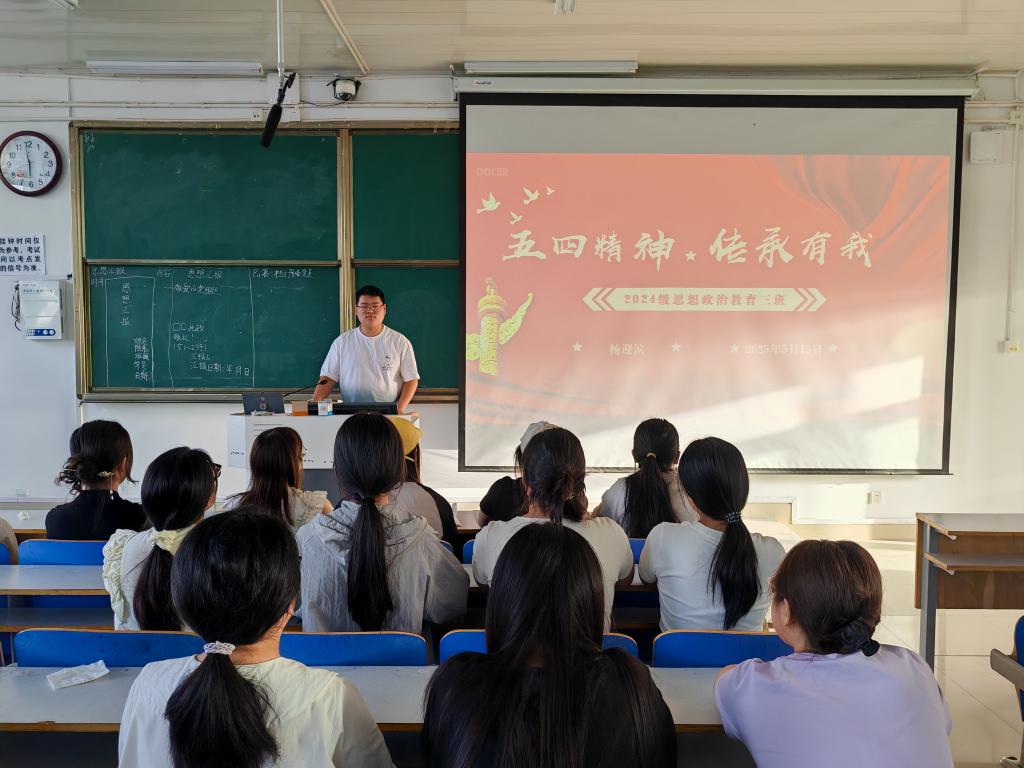 为深入学习贯彻五四精神,引导同学们坚定理想信念,ok138cn太阳集团5292024级思想政治教育三班于5月15日在社科楼514开展了“五四精神,传承有我”主题团课活动。本次团课由团支书杨迎滨主持,三班全体同学参与。