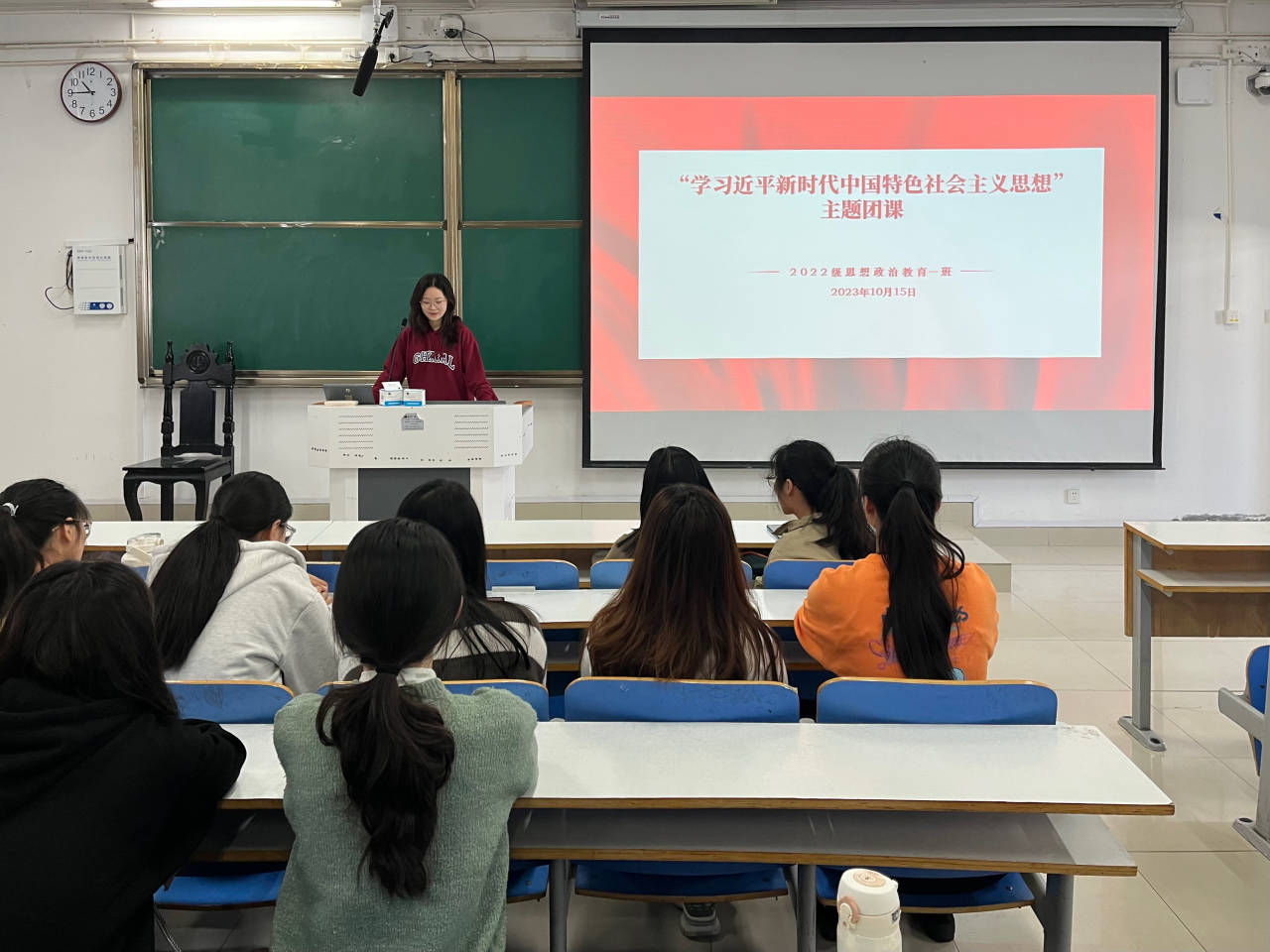 为进一步贯彻习近平新时代中国特色社会主义思想,10月15日上午,ok138cn太阳集团5292022级思想政治教育一班在社科楼514教室召开“学习近平新时代中国特色社会主义思想”主题团课。我院2022级思想政治教育一班全体同学共同参与本次团课,团课由团支书李佳茹主持。