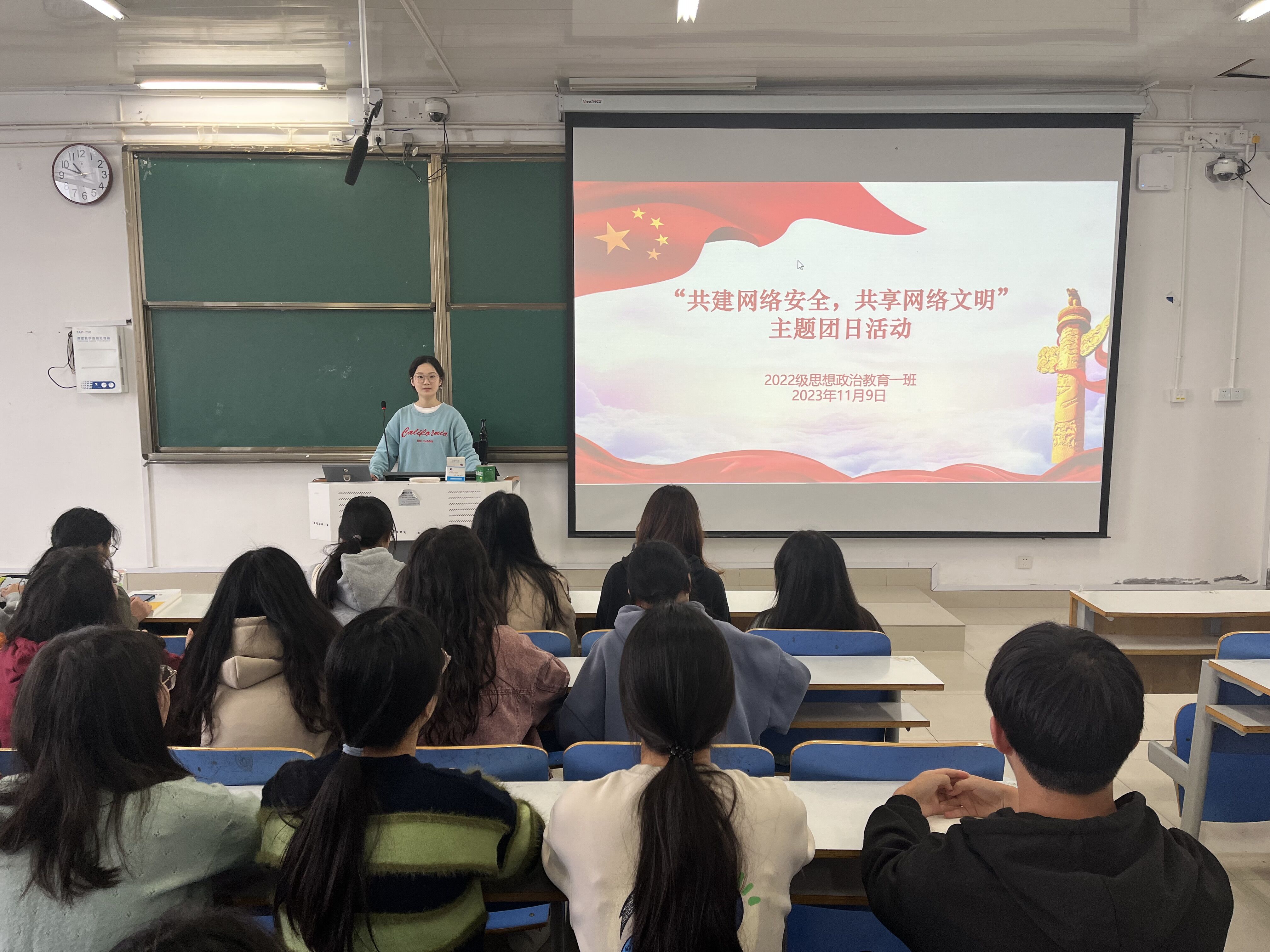 为做好网络安全宣传工作,提升同学们的网络安全意识,11月9日上午,ok138cn太阳集团5292022级思想政治教育一班在社科楼514教室开展“共建网络安全,共享网络文明”主题团日活动。我院2022级思想政治教育一班全体同学共同参与本次活动,活动由团支书李佳茹主持。