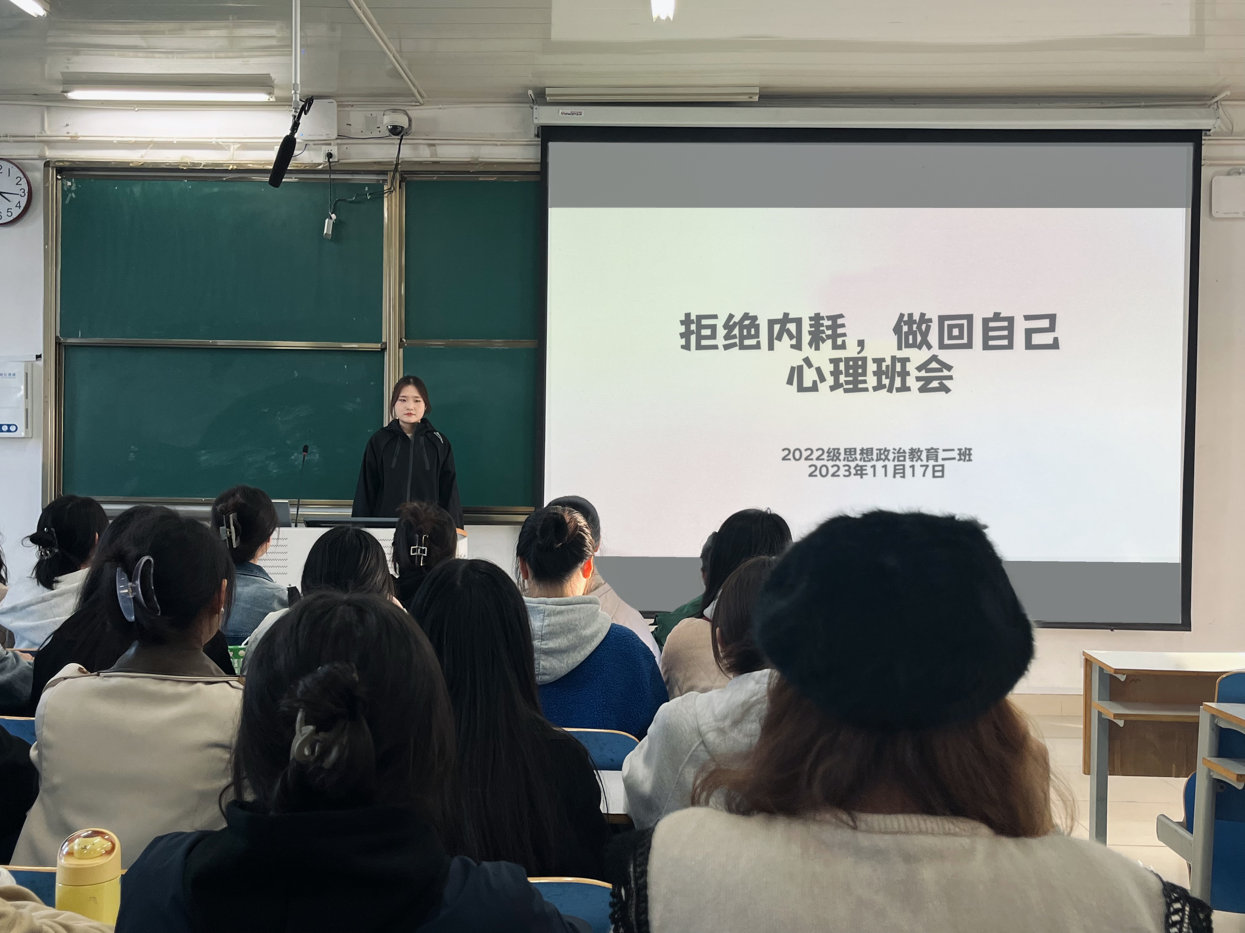 11月17日下午,ok138cn太阳集团5292022级思想政治教育二班在社科楼514教室开展“拒绝内耗,做回自己”心理班会。我院2022级思想政治教育二班全体成员共同参与此次心理班会。班会由心理委员张嘉芮主持。
