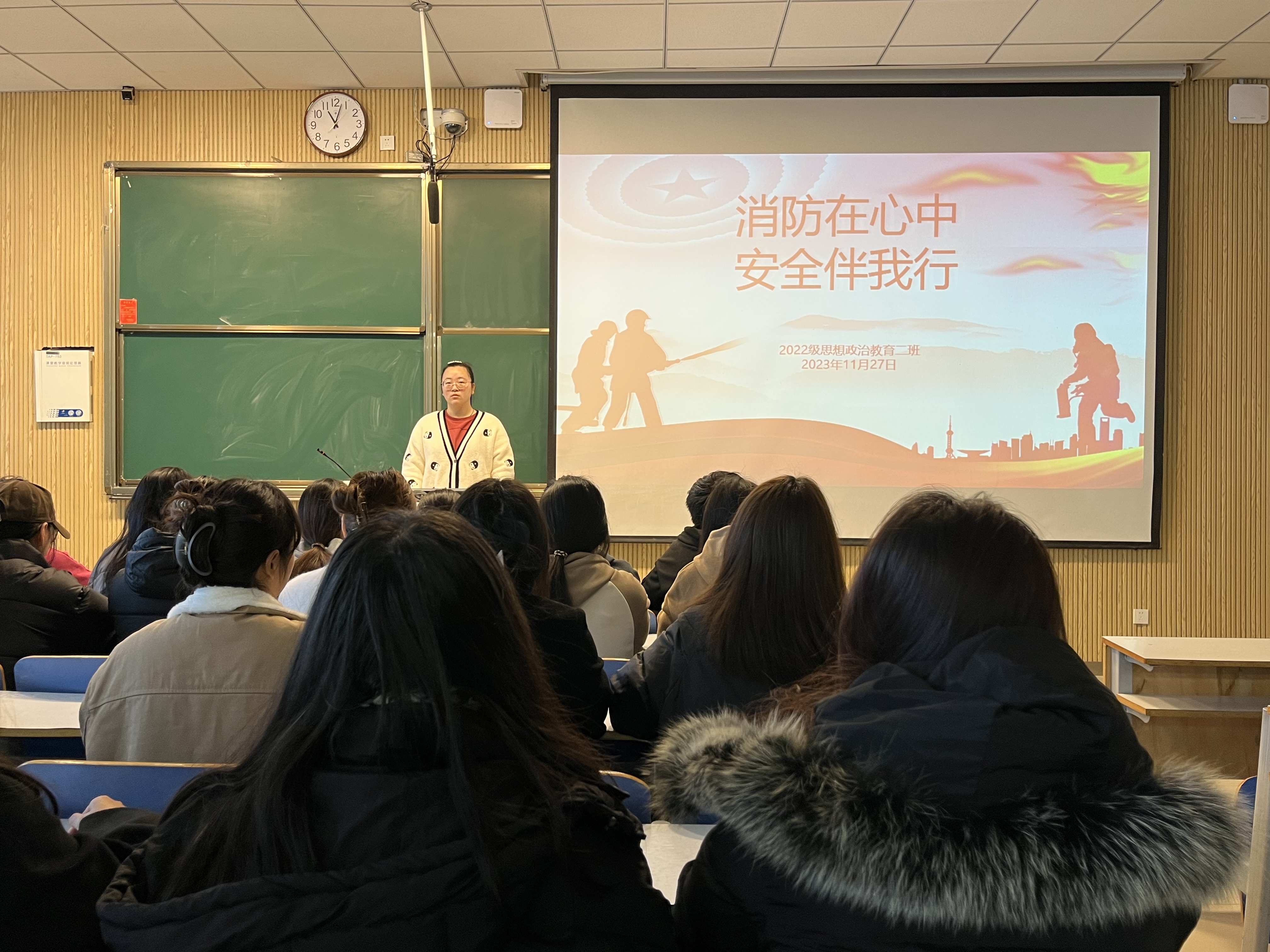 班会从“校园消防安全知识”、“防火基本原则和措施”、“灭火的基本原理和方法”、“消防安全注意事项”四个方面展开,通过引用火灾真实案例,让同学们真真切切感受潜在的消防风险隐患。同时让大家了解如何预防火灾、火场逃生的方式、灭火器如何使用等消防安全知识,进一步加强同学们消防安全技能,认识到防患于未然的重要性,提醒同学们应为自己负责、为他人负责,关爱生命、关注消防。在班会的最后,李佳音强调了宿舍用电安全,她指出,同学们要严格遵守宿舍管理条例,自觉做到“人走电断”、不使用违规电器等。