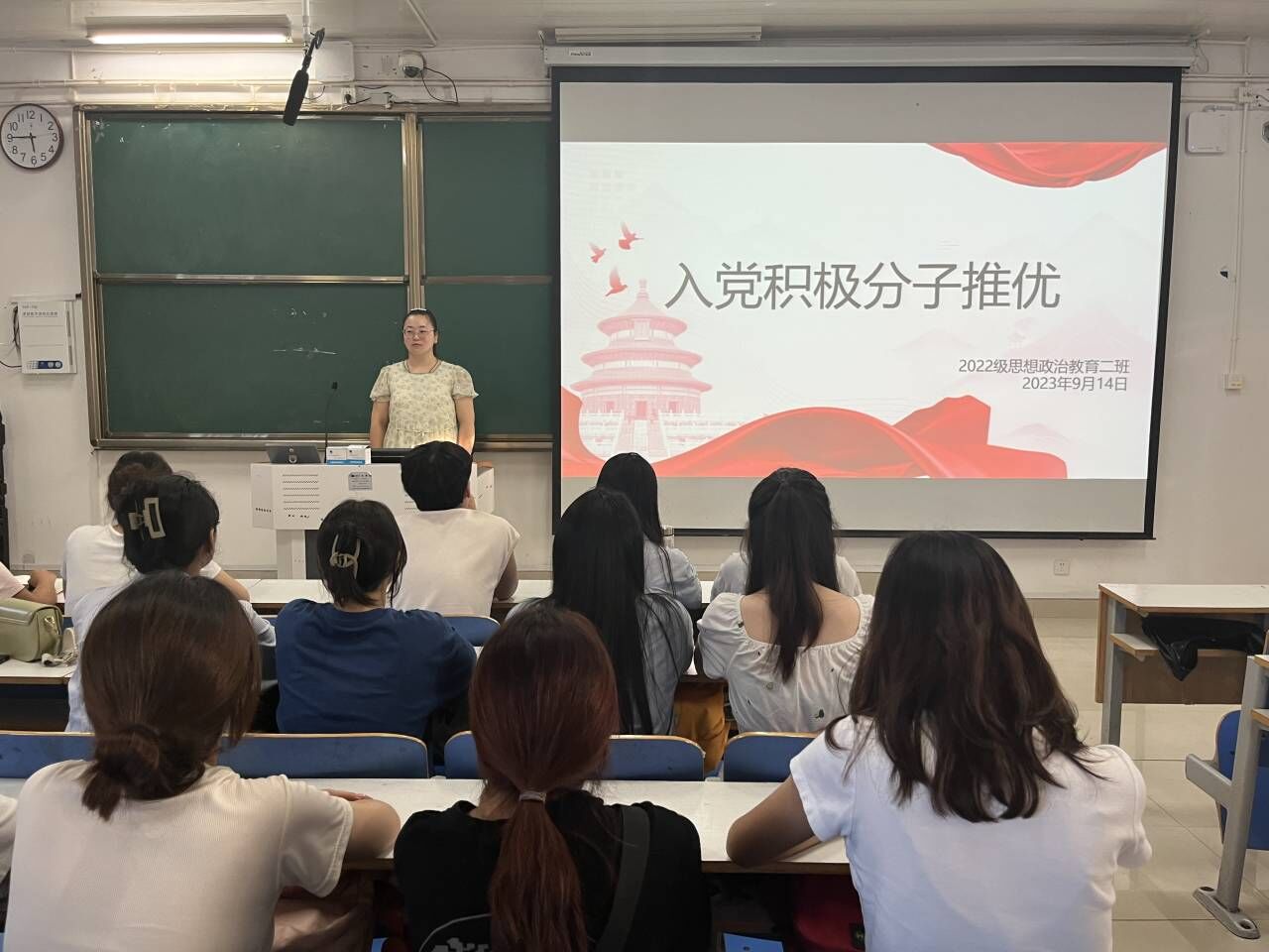 9月14日下午,ok138cn太阳集团5292022级思想政治教育二班在社科楼514教室召开入党积极分子推优大会。我院2022级思想政治教育二班杨春艳老师和全体同学参与本次班会。班会由团支书李佳音主持。