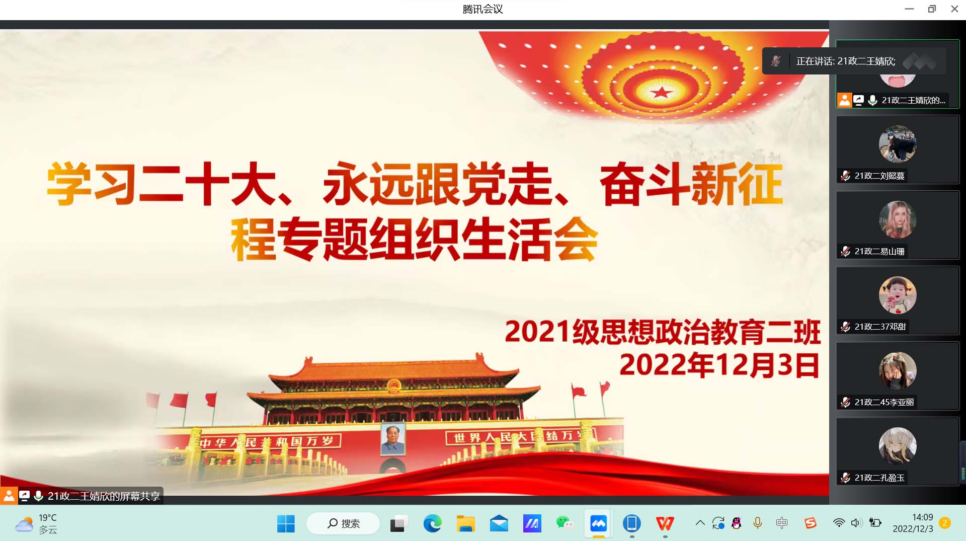 12月3日下午,ok138cn太阳集团5292021级思想政治教育二班团支部在腾讯会议召开学习二十大、永远跟党走、奋进新征程专题组织生活会。2021级思想政治教育二班全体团员参加此次组织生活会。组织生活会由团支书王婧欣主持。