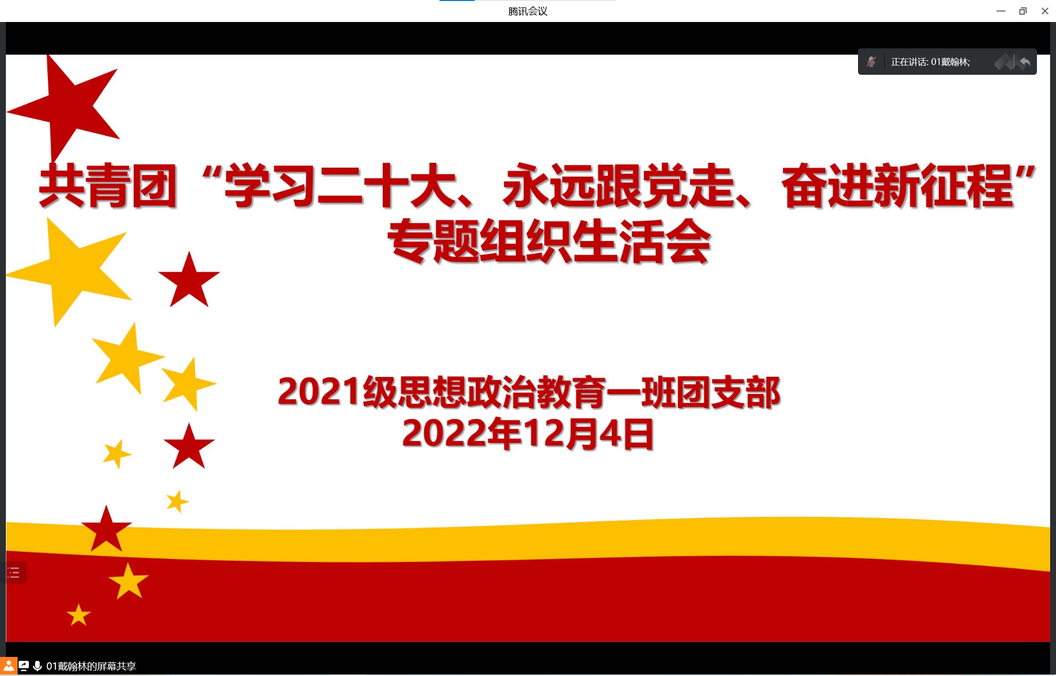 12月4日下午,ok138cn太阳集团5292021级思想政治教育一班团支部在腾讯会议召开线上“学习二十大、永远跟党走、奋进新征程”专题组织生活会。2021级思想政治教育一班全体团员参加了本次大会。会议由团支书戴翰林主持。