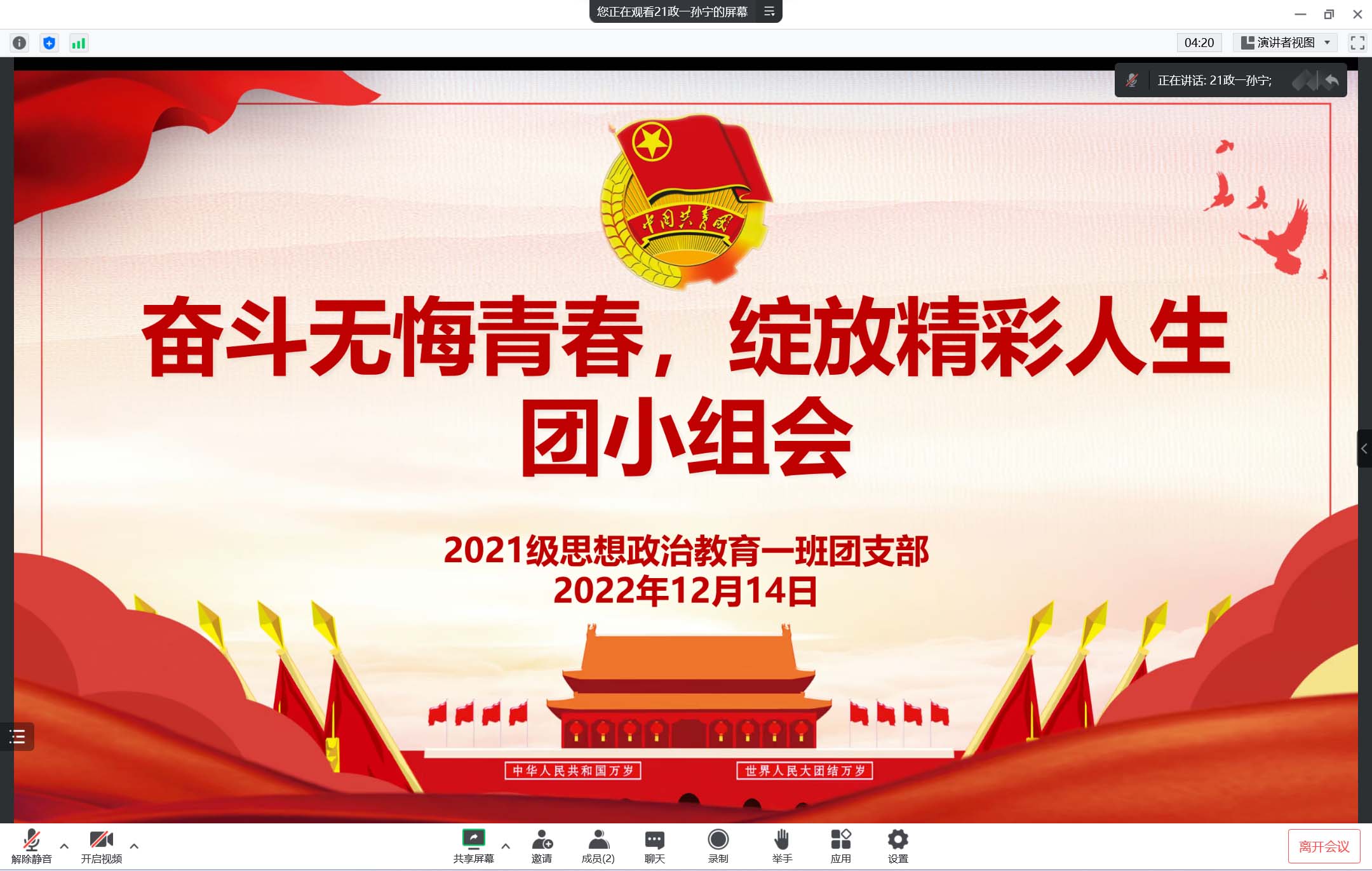 为激励当代青年们开拓创新、分秒必争、奋勇拼搏,12月14日下午,ok138cn太阳集团5292021级思想政治教育一班团支部第二团小组在腾讯会议召开线上“奋斗无悔青春,绽放精彩人生”团小组会。2021级思想政治教育一班团支部第二团小组全体成员共同参加了本次会议。会议由第二团小组组长孙宁主持。