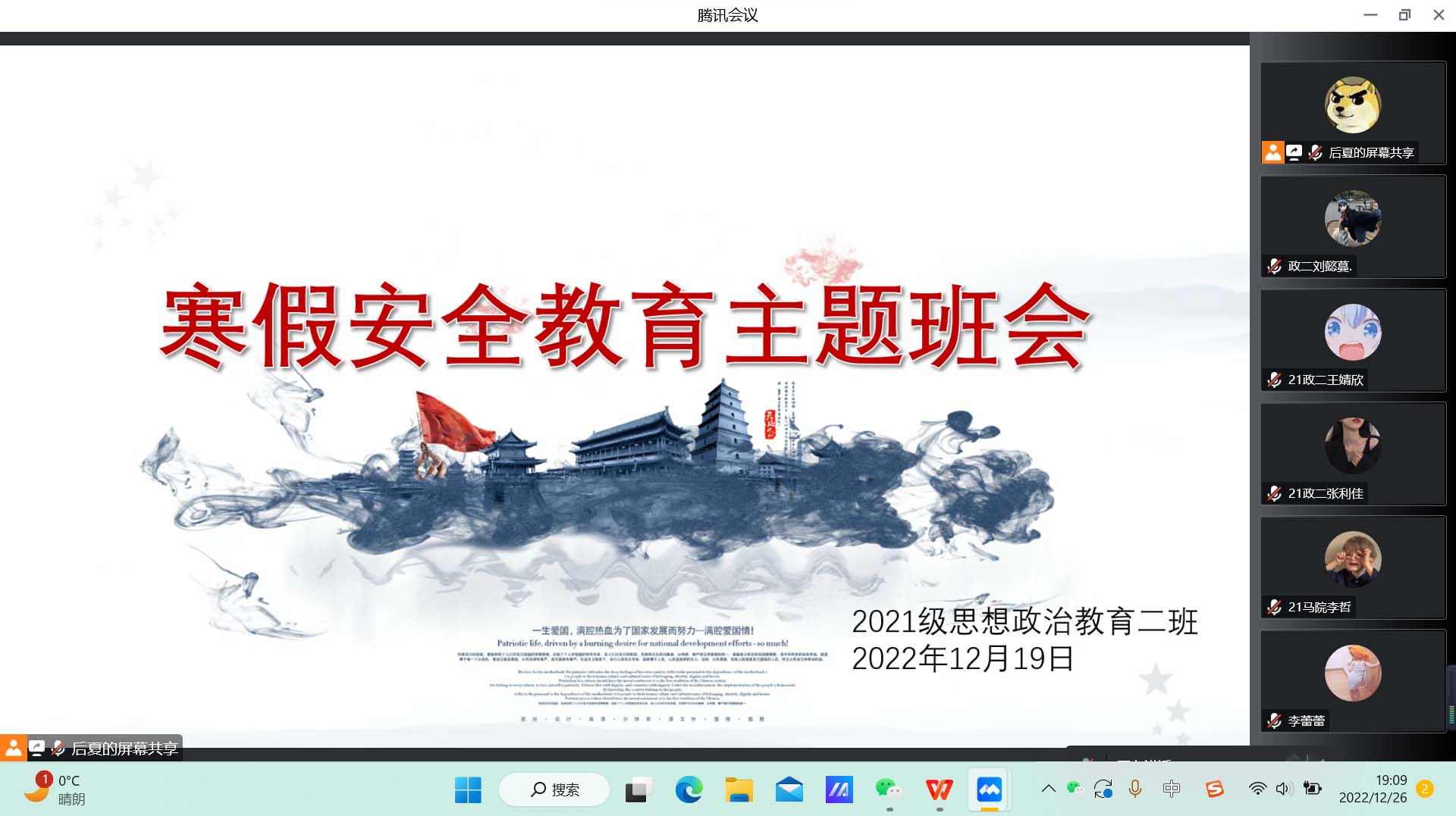 12月19日下午,ok138cn太阳集团5292021级思想政治教育二班在腾讯会议召开寒假安全教育主题班会。2021级思想政治教育二班全体成员共同参加此次主题班会。班会由副班长任振豪主持。