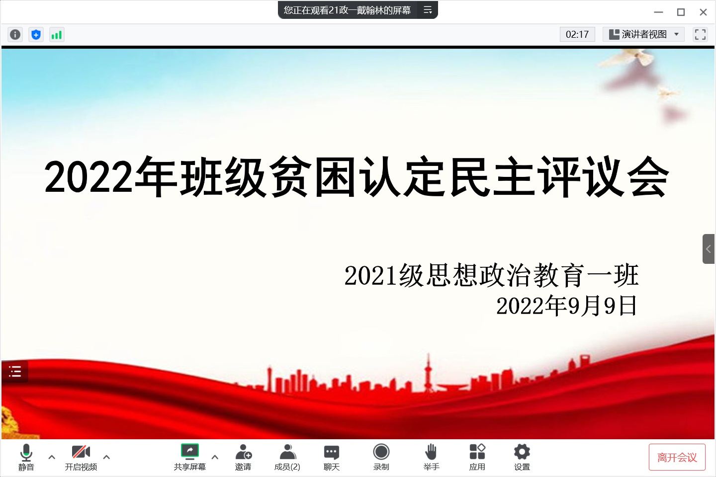 9月9晚上,ok138cn太阳集团5292021级思想政治教育一班在腾讯会议召开线上2022年班级贫困认定民主评议会。评议会由辅导员曹菁菁、学生会权益保障部成员及2021级思想政治教育二班评议小组成员参加。评议会由班长戴翰林主持。