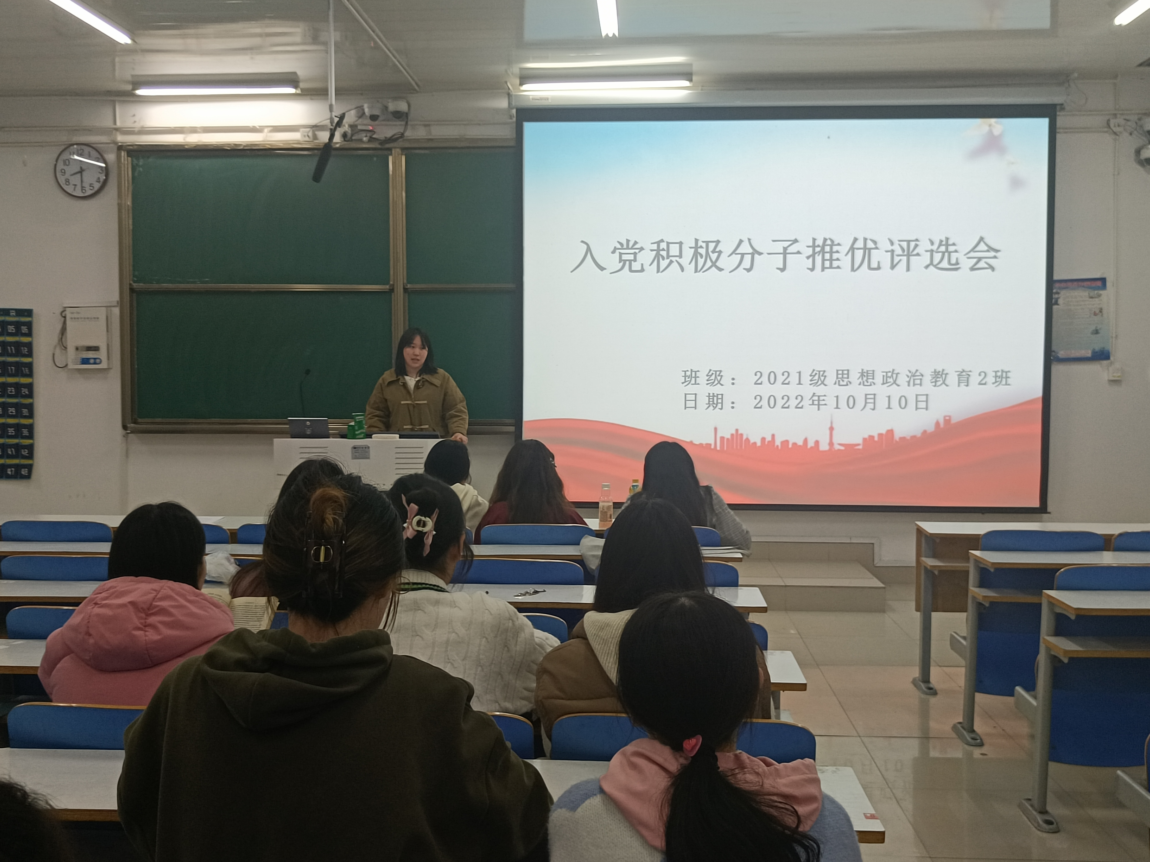 10月10日上午,ok138cn太阳集团5292021级思想政治教育二班在社科楼514教室召开入党积极分子推优评选会。2021级思想政治教育二班全体成员参加此次评选会。评选会由团支书王婧欣主持。
