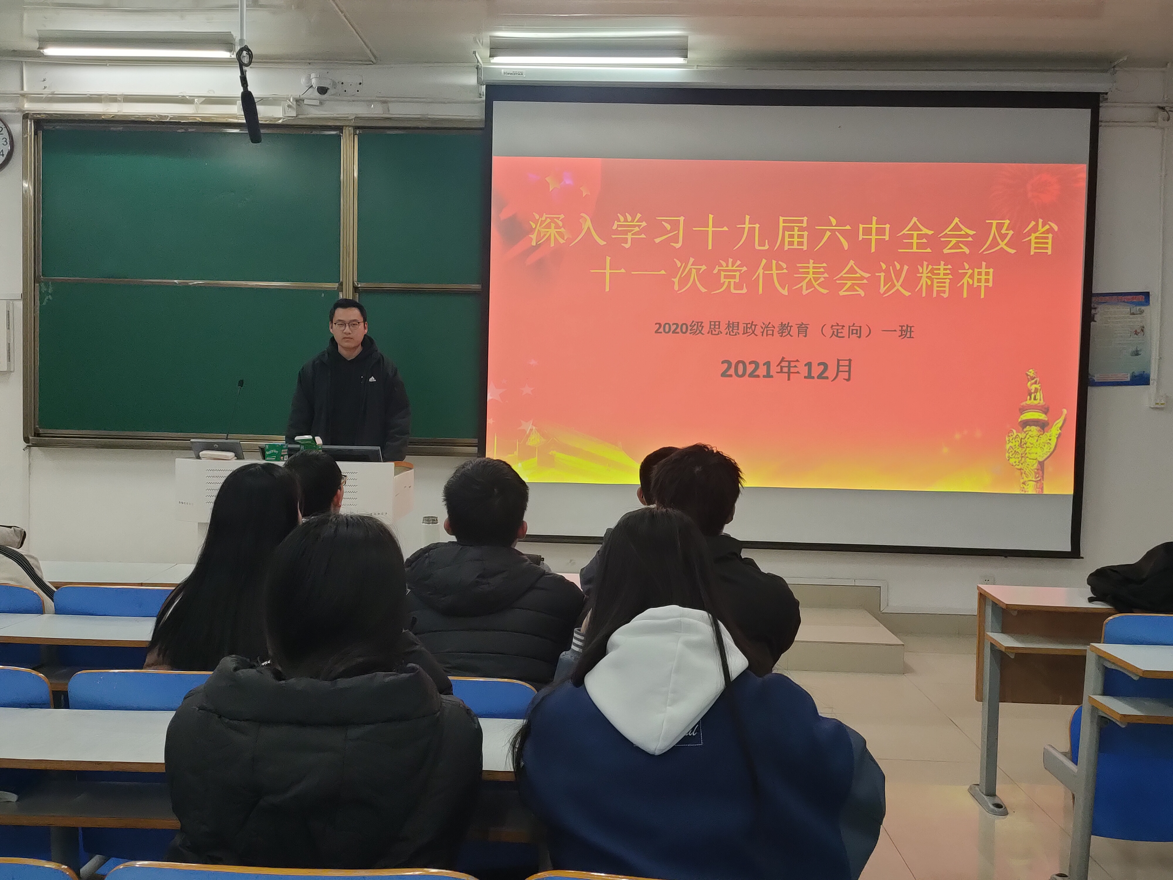 12月5日下午,ok138cn太阳集团5292020级思想政治教育定向一班团支部在社科楼514教室举办了深入学习党的十九届六中全会及省第十一次党代会精神主题团课。ok138cn太阳集团5292020级思想政治教育定向一班团支部全体成员参与了本次团课。