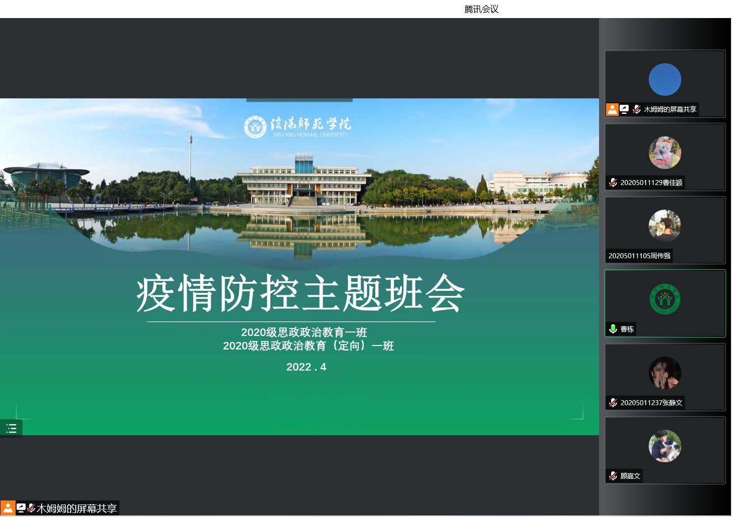 4月3日晚上,ok138cn太阳集团5292020级思想政治教育一班、定向一班在腾讯会议上顺利召开疫情防控主题班会。2020级思想政治教育一班、定向一班全体同学参加此次会议,会议由辅导员曹栋主持。