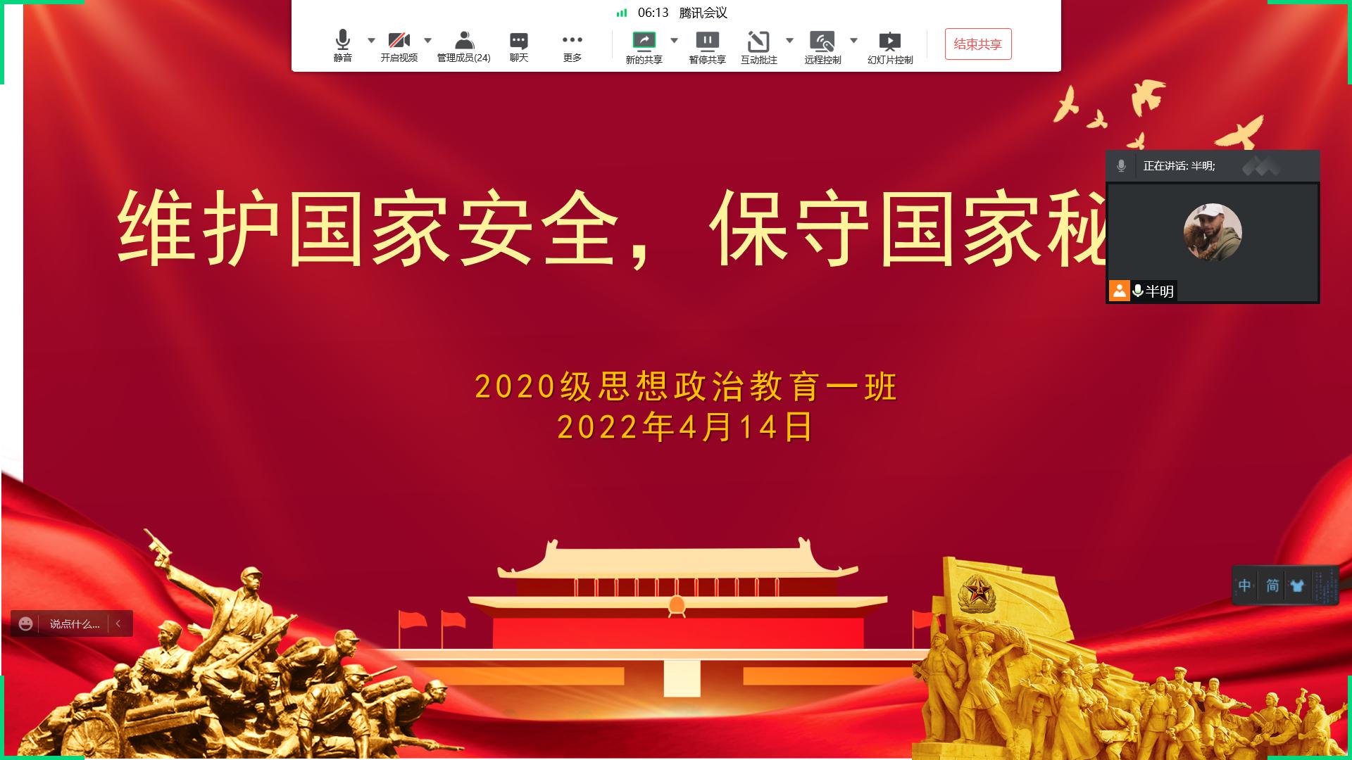 4月14日晚,ok138cn太阳集团5292020级思想政治教育一班在腾讯会议组织召开“维护国家安全,保守国家秘密”主题班会。2020级思想政治教育一班全体同学共同参加本次班会,班会由副班长白帅豪主持。