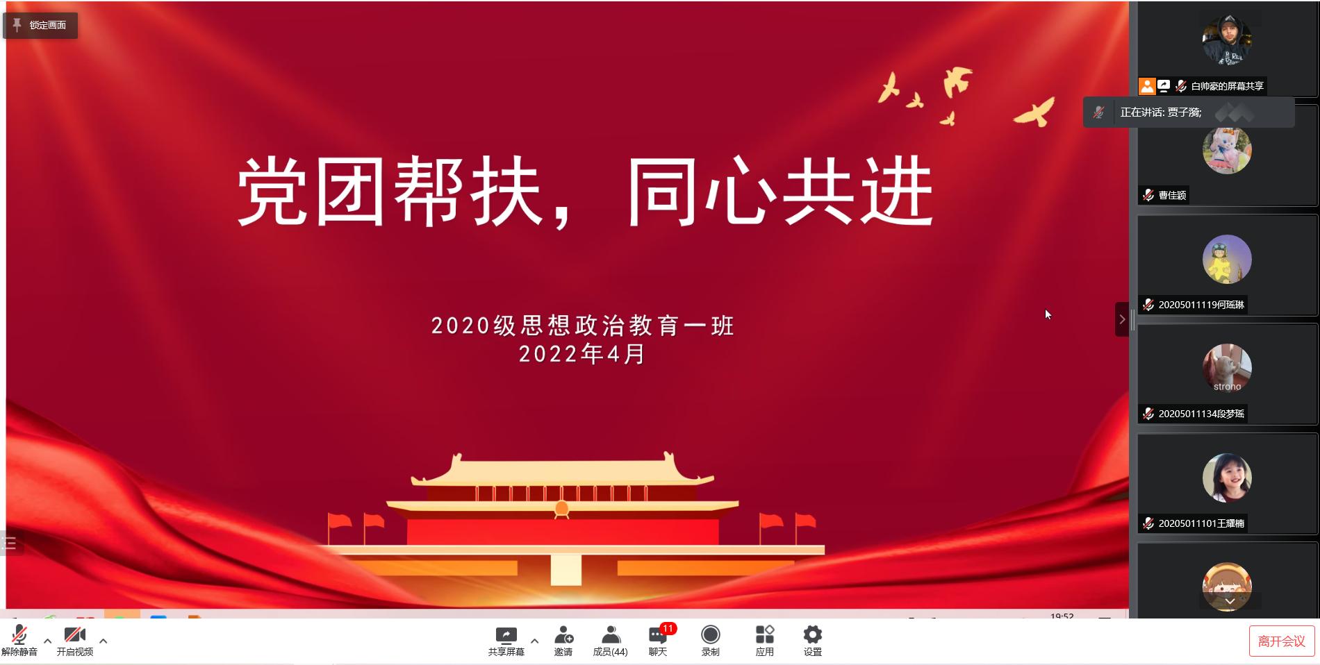4月25日晚,ok138cn太阳集团5292020级思想政治教育一班在腾讯会议上顺利开展“党团帮扶,同心共进”活动。我院预备党员贾子漪与2020级思想政治教育一班全体同学参加了本次活动,活动由团支部副书记白帅豪主持。