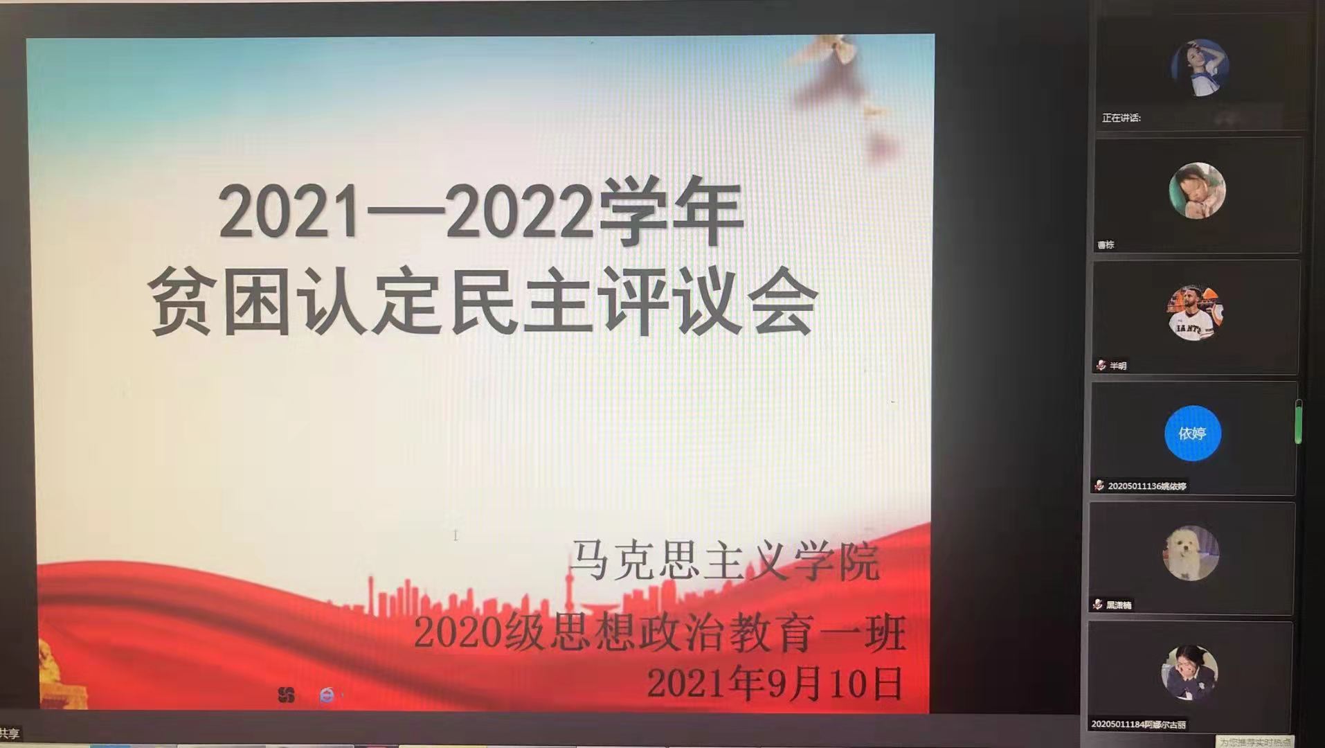 9月10日上午,ok138cn太阳集团5292020级思想政治教育一班通过腾讯会议线上平台顺利开展2021—2022学年贫困认定民主评议会。辅导员曹栋、评议小组成员、申请人以及监督人员参与了本次会议,本次会议由团支书卢茜雨主持。