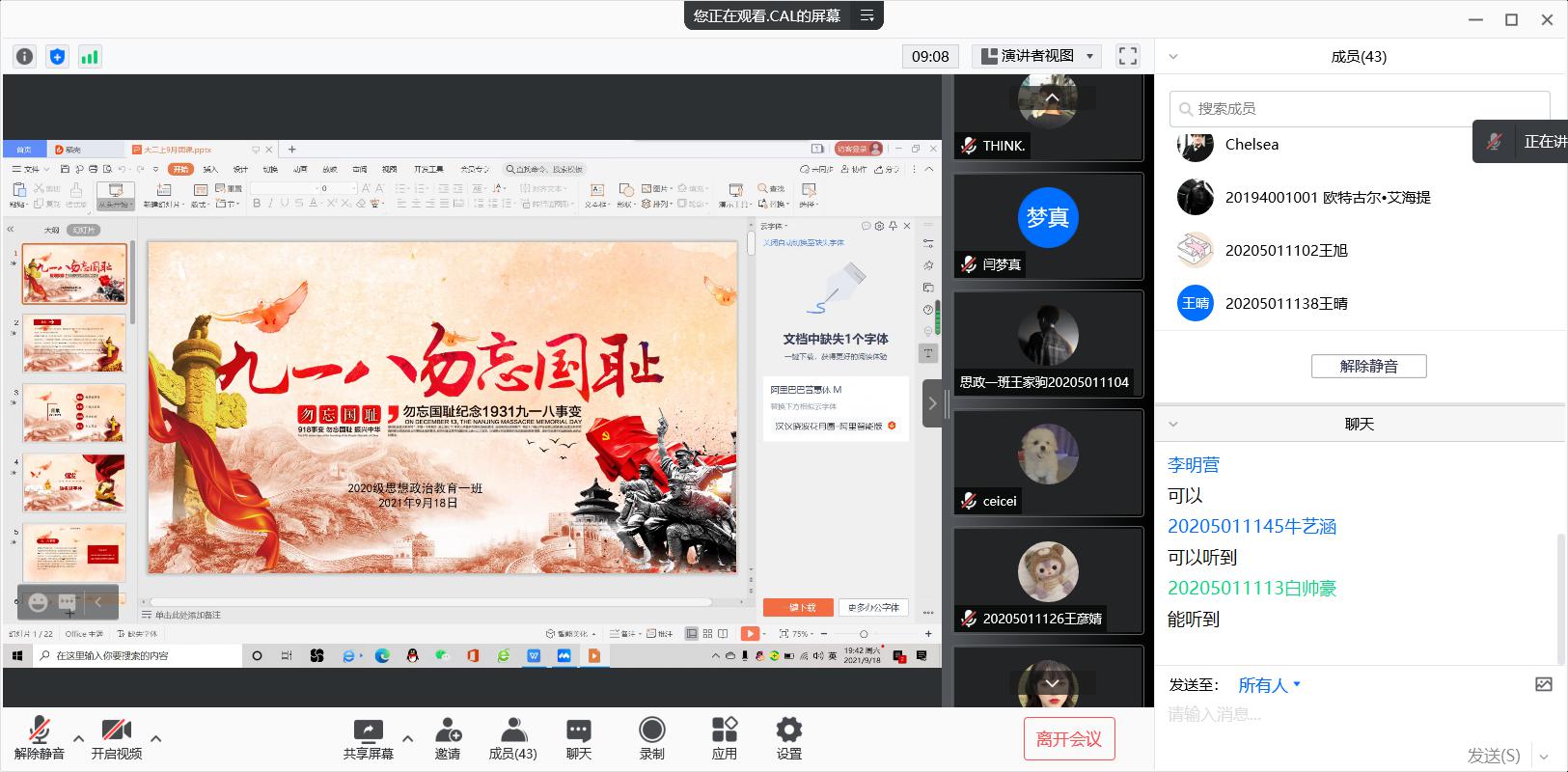 9月18日,ok138cn太阳集团5292020级思想政治教育一班在腾讯会议上召开“九一八勿忘国耻”团课。2020级思想政治教育一班全体同学参加此次团课,团课由团支书卢茜雨主持。