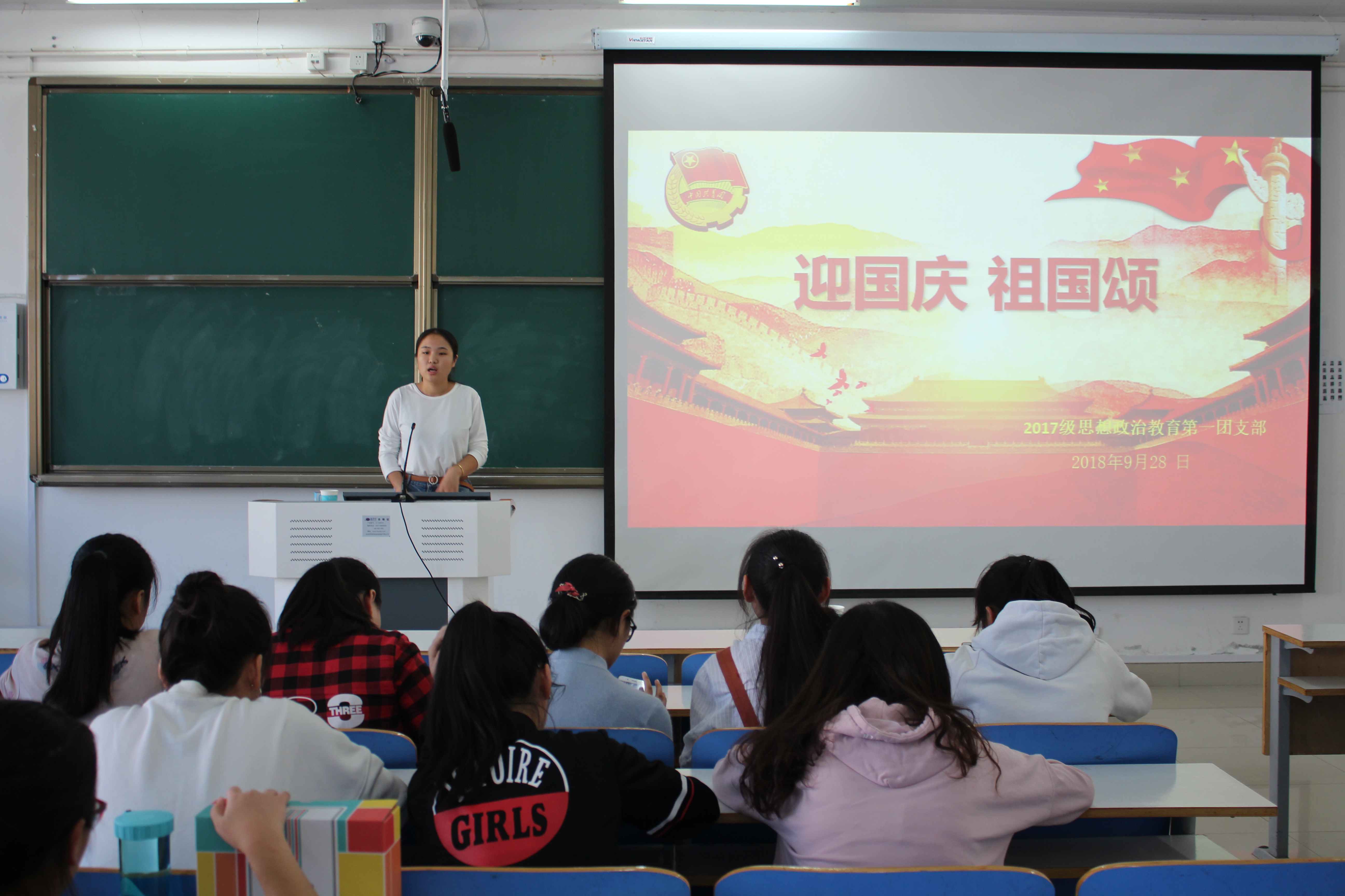 为献礼祖国华诞69周年,祝福伟大的祖国繁荣昌盛,在新时代更加坚定理想信念,9月28日上午,2017级思想政治教育一班全体同学在社科楼516教室举行了“迎国庆,祖国颂”主题班会。本次班会由团支书谢文静和组织委员吴亦昕共同主持。